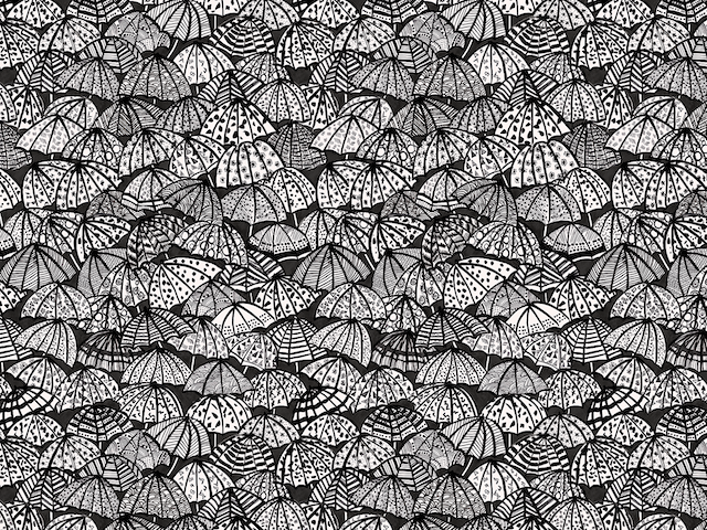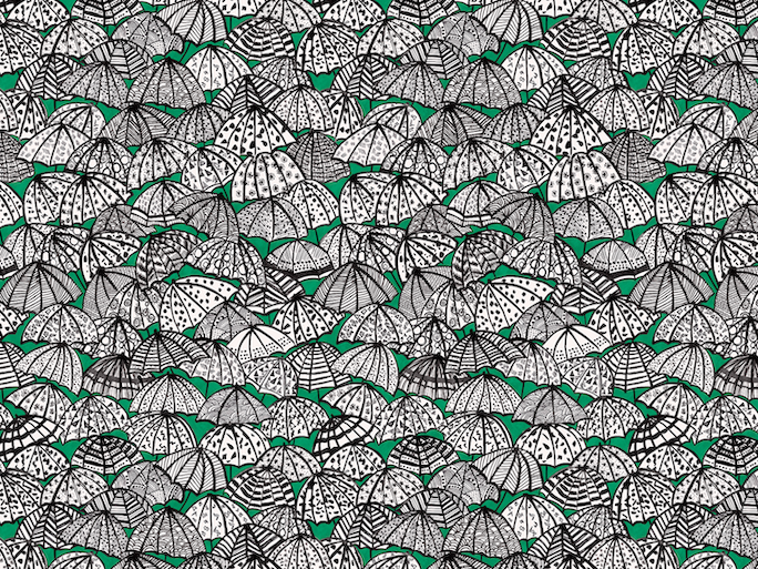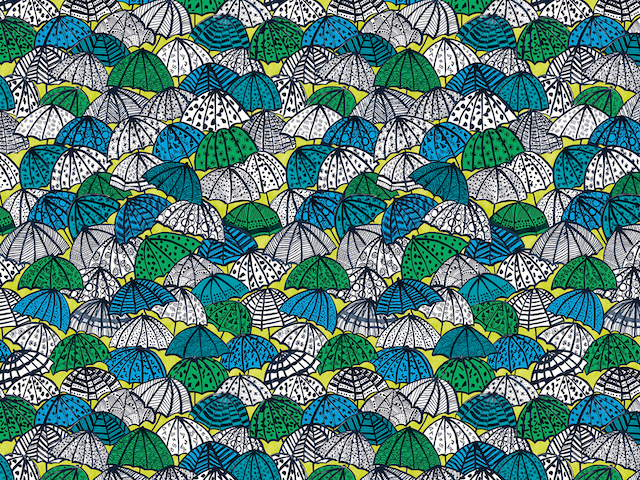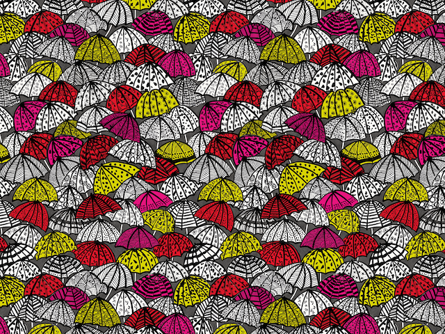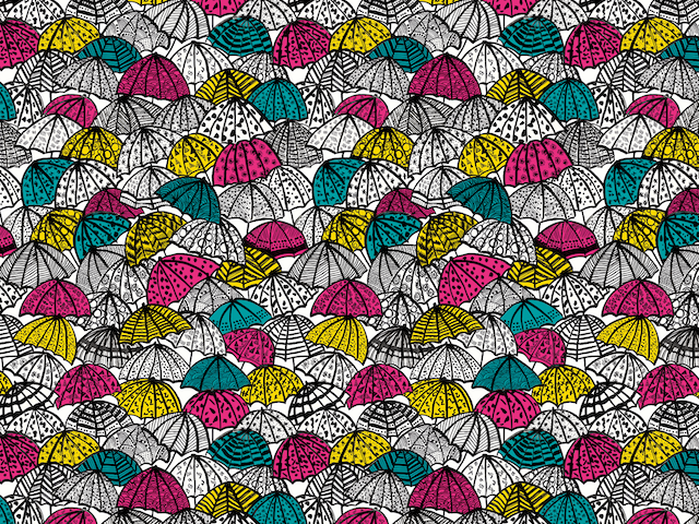 Rainy days are always welcome when we have Jolly Brollies to scatter splashes of colour and quirky energy onto our walls. Monochromatic pen and ink outlines link with deep pools of magenta, sunflower yellow and petrol blue highlights.