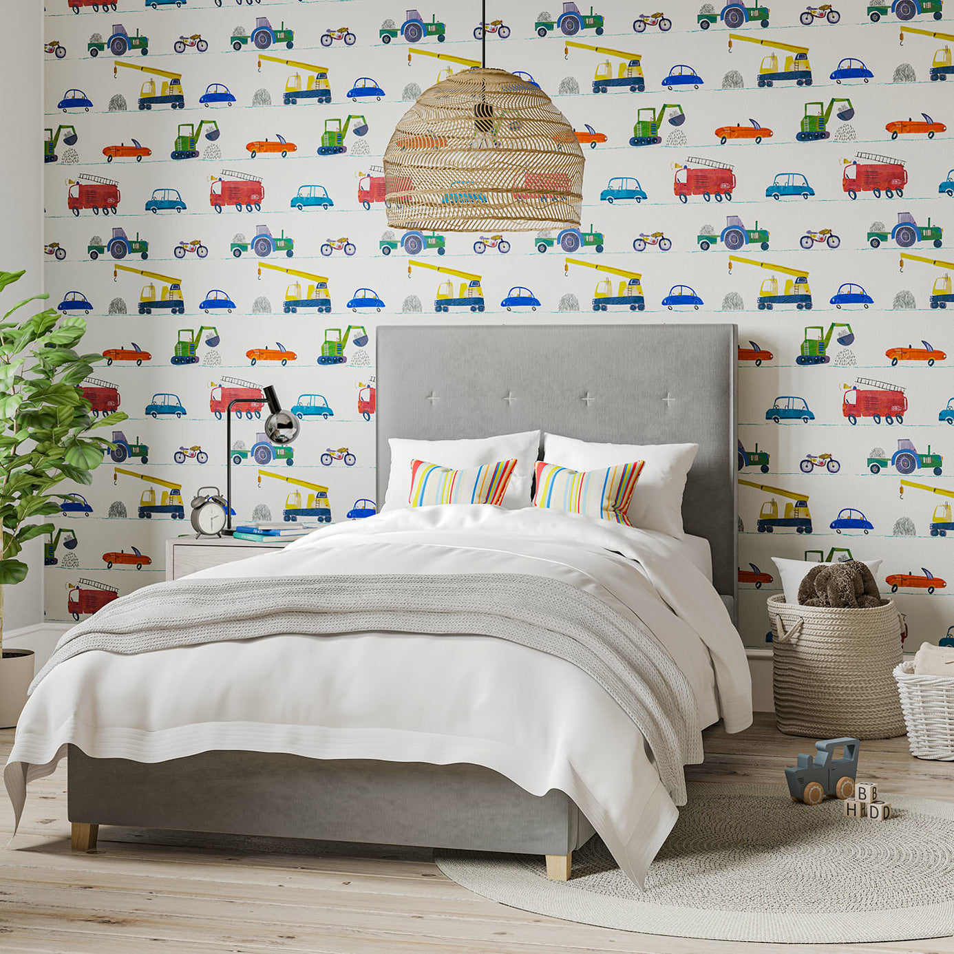 Spot your favourite vehicles on this colourful, fun Harlequin design. Whether it’s a drive to the beach, visit to the farm or you’re heading off to save the day, let imaginations run wild with our motor inspired wallpaper journey!