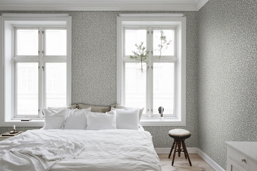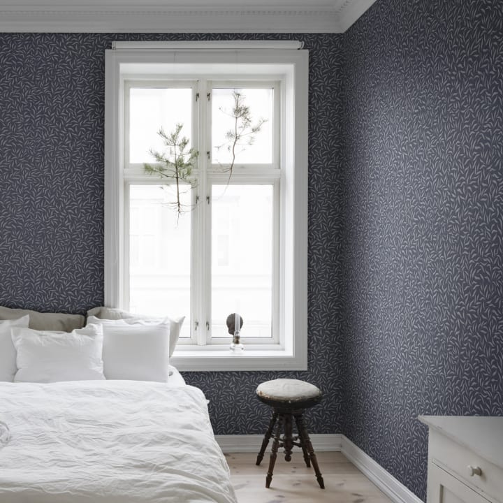 Wallpaper Karolina blue has a detailed pattern of pretty bay leaves that create an elegant and organic setting. Karolina makes the room into a palace garden with luscious treillage. During the Gustavian era, bay leaves were often used in carved decorations on mirrors and furniture. Karolina is part of collection Arv that is inspired by the 18th century Gustavian era of Sweden.