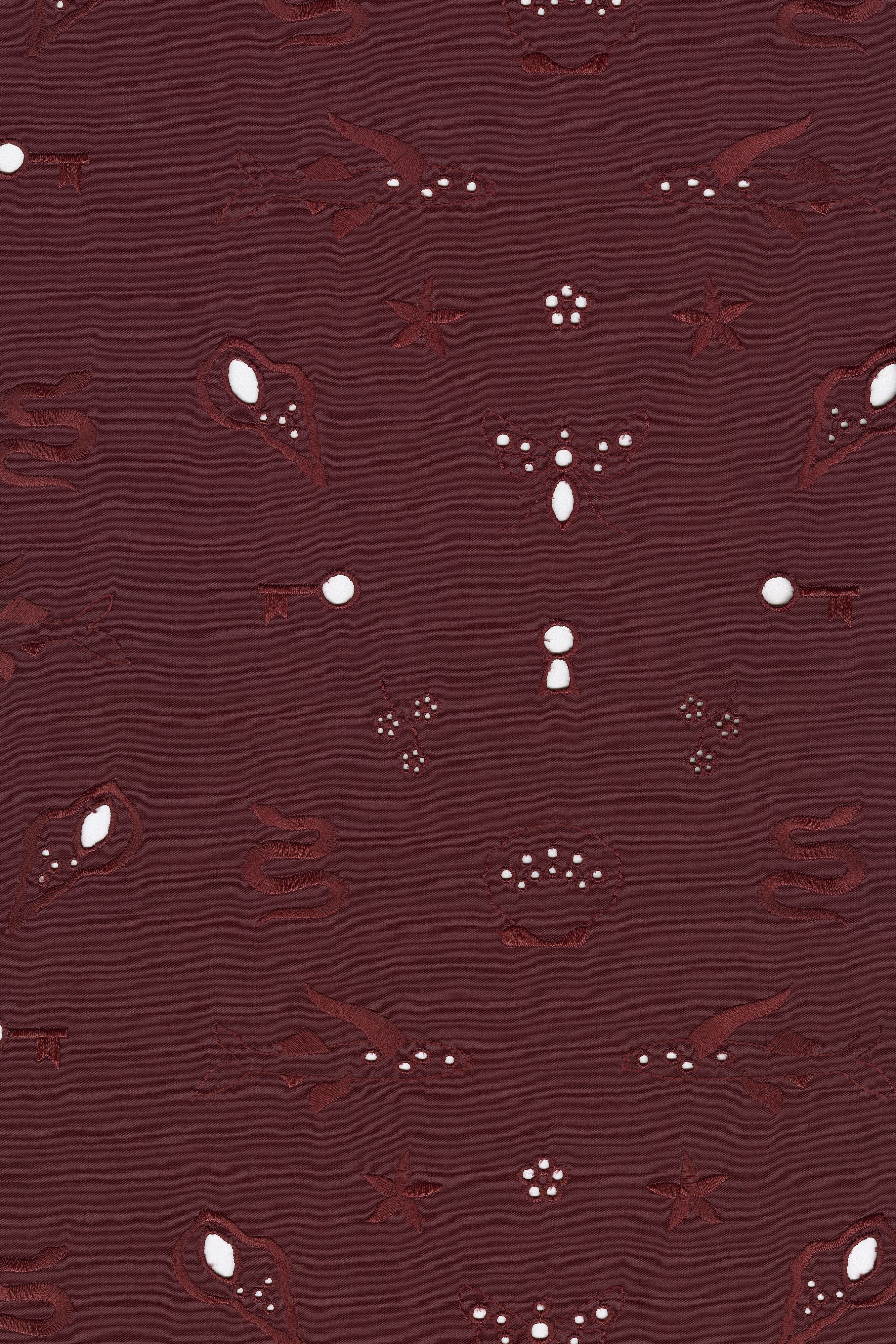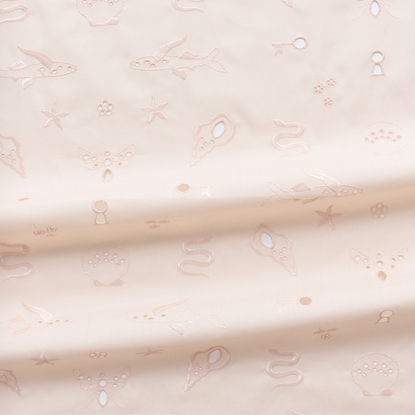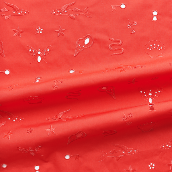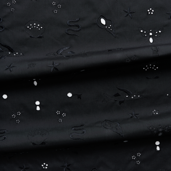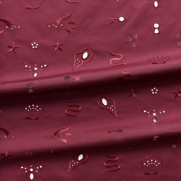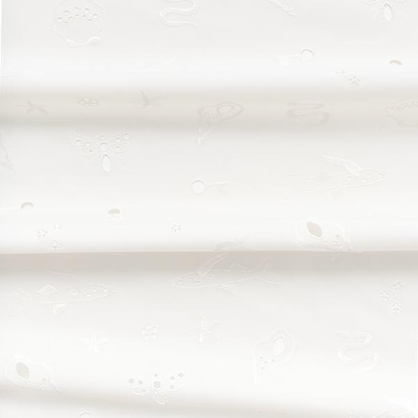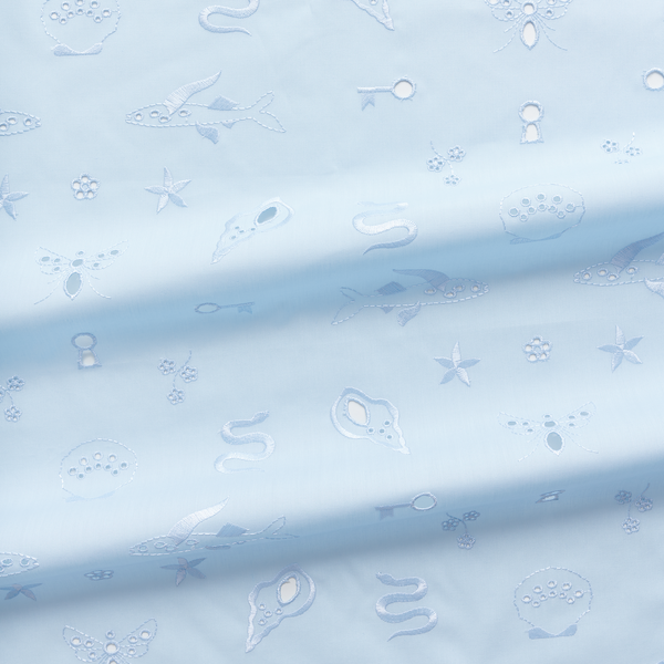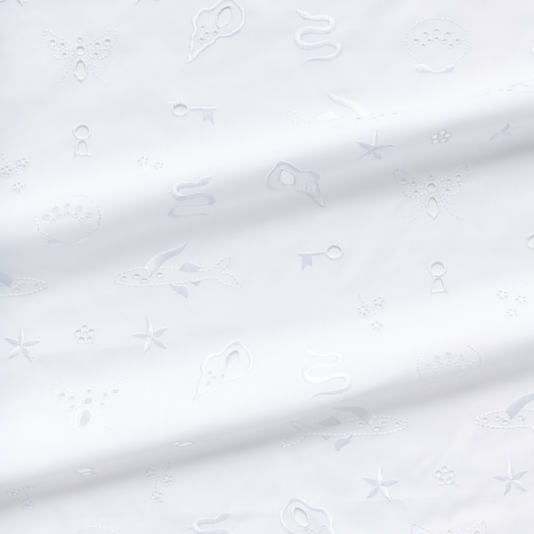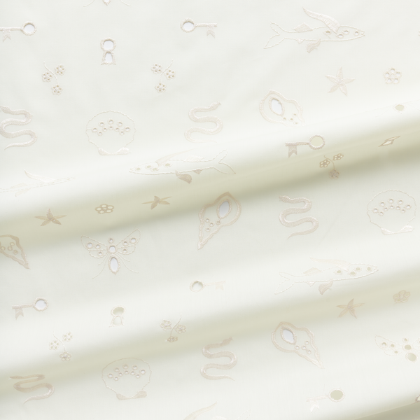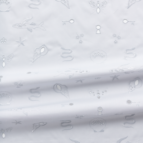 A broderie anglaise with a Parisian sensibility and a playful sense of irony, Ketaki is classic in technique and totally contemporary in attitude. Curious pattern elements like snakes, keys and conches embroidered in tonally matched shiny thread are laid out with the precision of a specimen cabinet on the crisp poplin base. Defying any notion of tradition, colours are intense or crisp, razor red and deep black, or optic white and arctic blue.