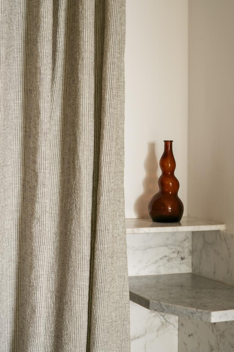 A yarn-dyed pure linen curtain featuring a narrow stripe. Double width, it can be used both horizontally and vertically. It bears the name of a hot, dry wind that reaches Spain’s southern coastline. Available in three colours.