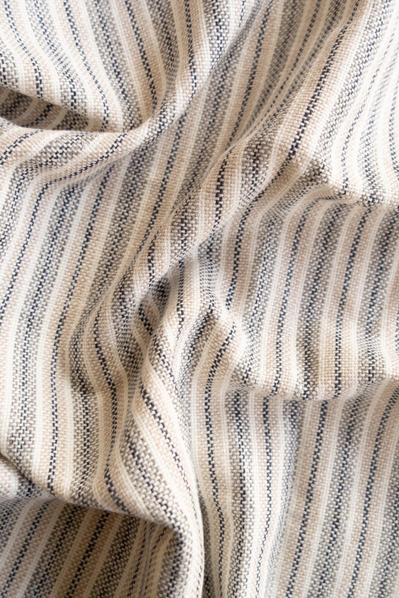 A narrow stripe for a linen and cotton fabric suitable for both upholstery and decoration. A textural weave, almost a sequence of regular “dashes”. All available colours share the alternating black and white in the sequence of stripes.