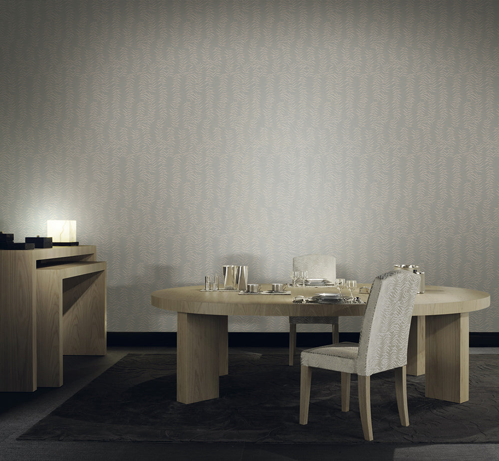 Has a textile inspiration with branches and small fern leaves, in five colorways in contrast with the background.