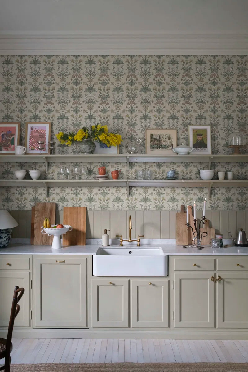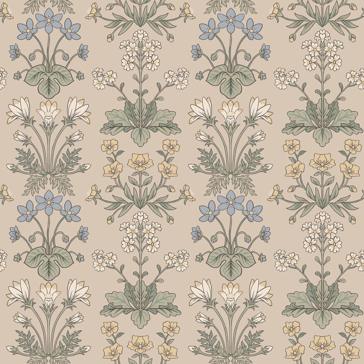 The lovely little bulbous plants that grow wild in Öland's habitat are the first signs of spring and the arrival of warmth. This rare medallion wallpaper includes Bluebell, Wood Anemone, Cowslip, and Sun Rose. The color scheme, Sandstone, comes with a beige base, soft green leaves, and cute flowers in warm yellows, white, and terracotta.