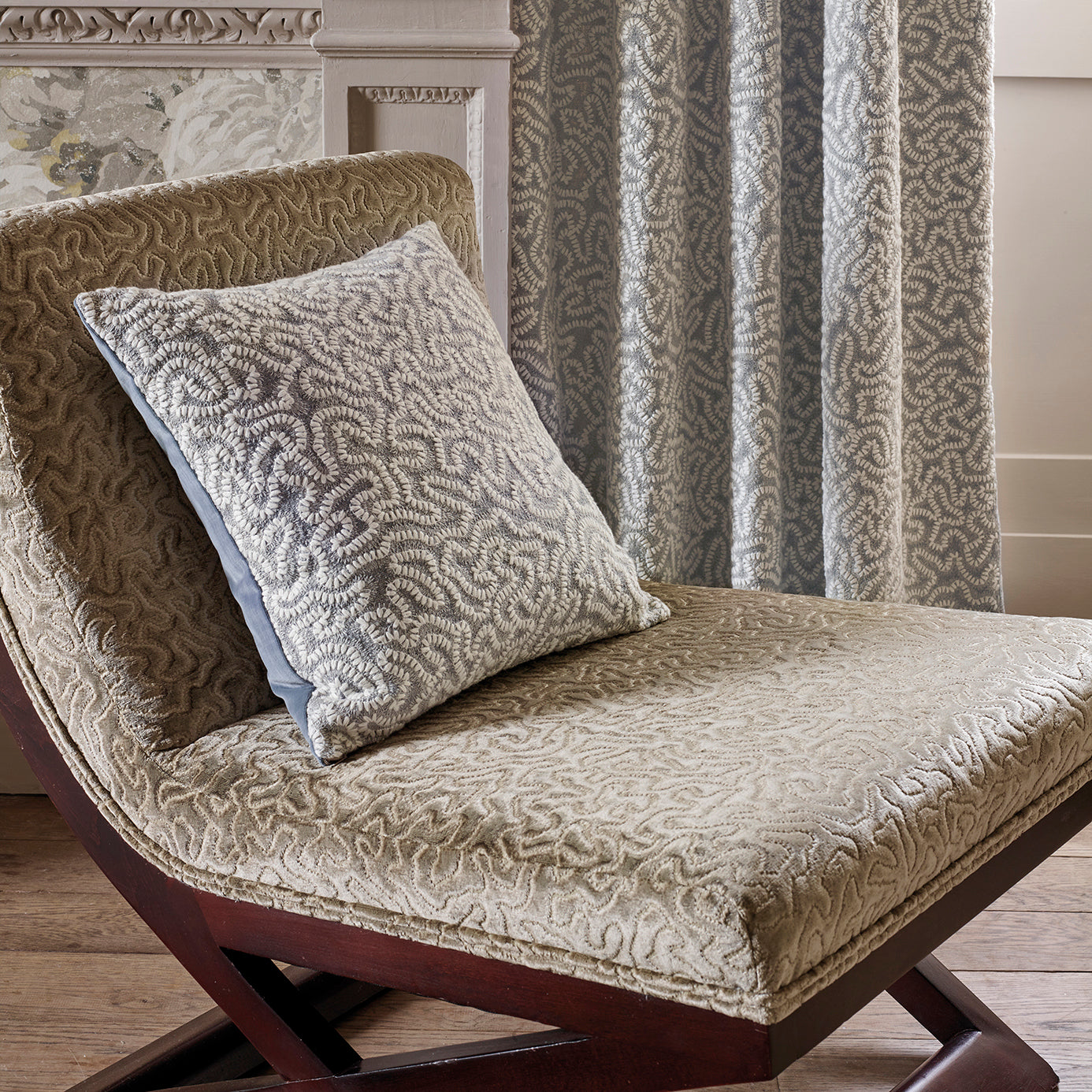 This full bodied embroidered fabric is inspired by the object d'art maze found in Chatsworth House. This semi-plain fabric features a delightfully varied all-over vermicelli pattern with additional textural interest in pale but interesting colourways.