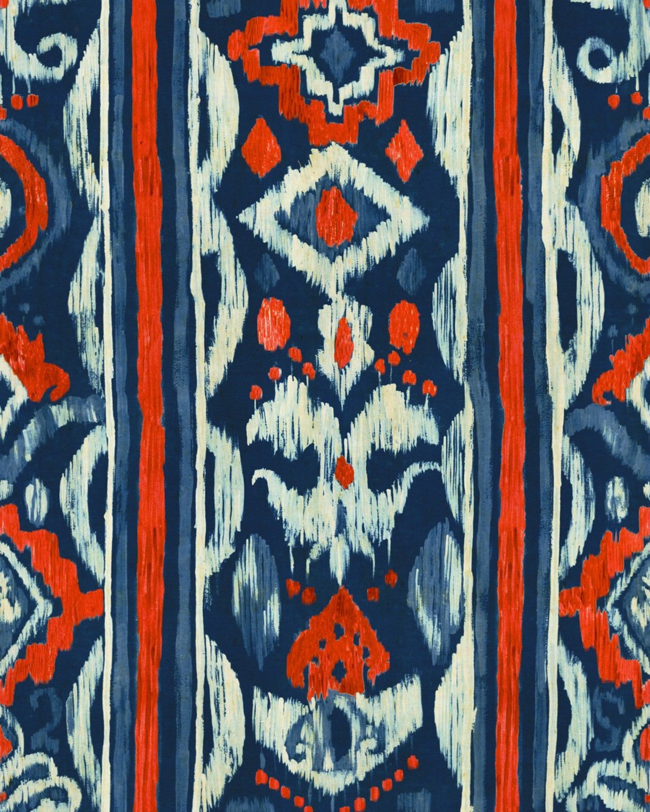 Wavy shades of blue and red dance against a deep indigo background, in an authentic Greek Ikat pattern that manifests local traditions. With big handmade strokes of colour, the pattern gives a spectacular visual impact, adding richness and Mediterranean style to any interior.