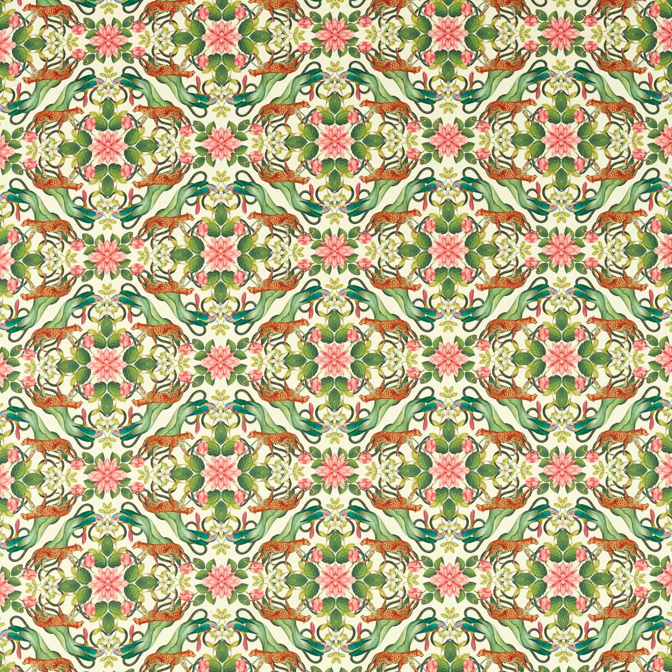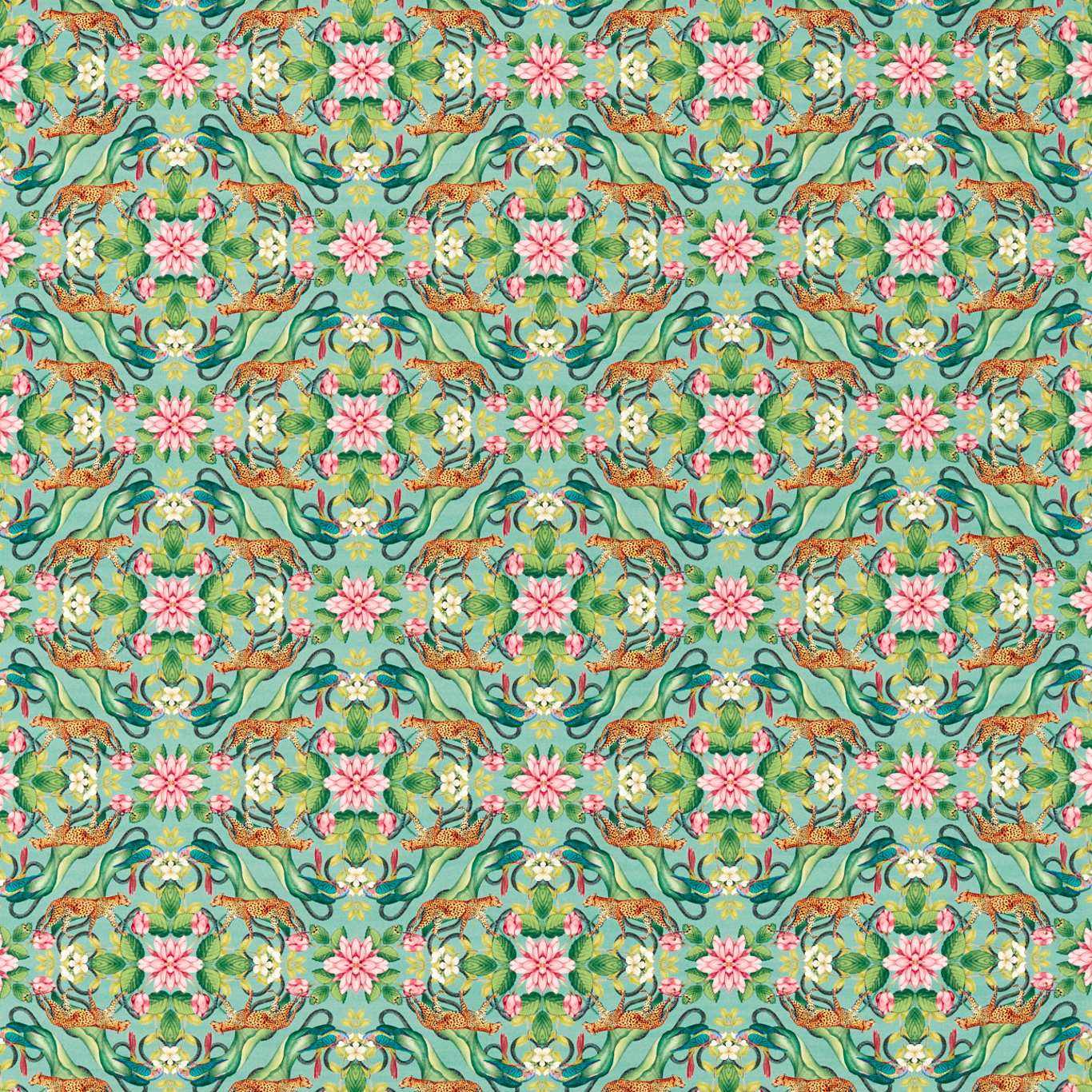 A menagerie is a curated collection of weird, wonderful and diverse things, which is what this fabric celebrates. Inspired by the unstoppable maximalist wave hitting interior design and fashion, the pattern mixes parrots, lush flora and water lilies, with the elusive yet powerful African Leopard. The Aqua and Ivory colourways are printed on bleached linen and our Blush colourway is on a soft velvet.