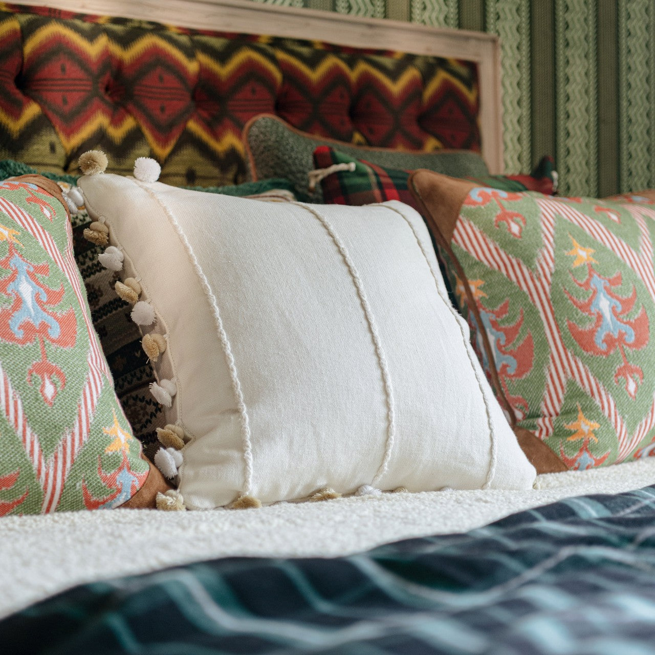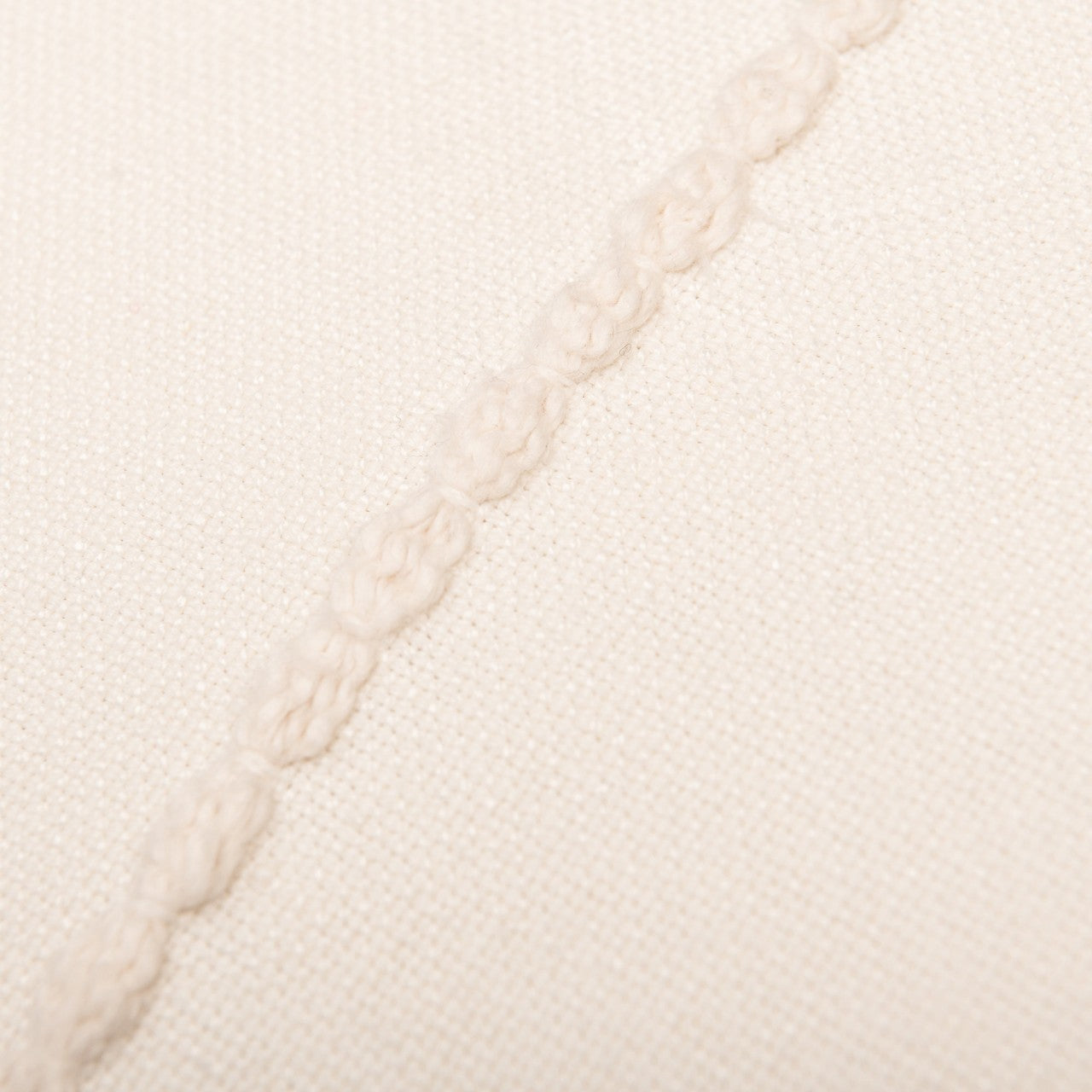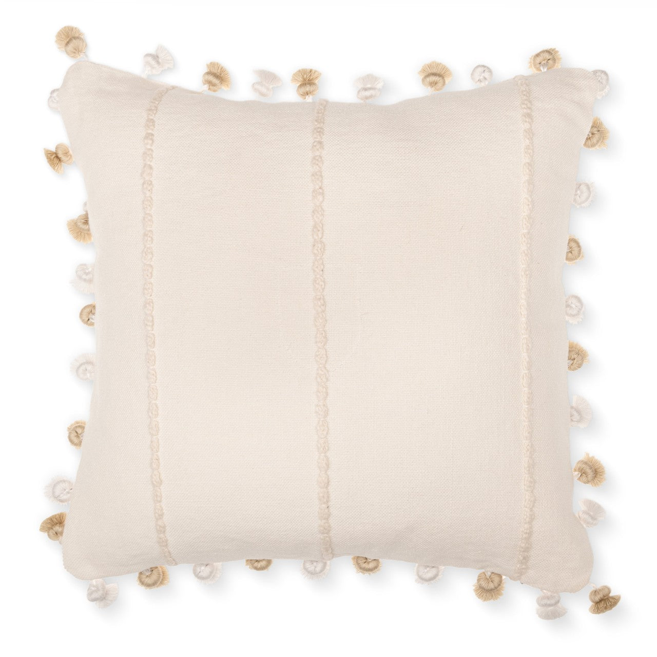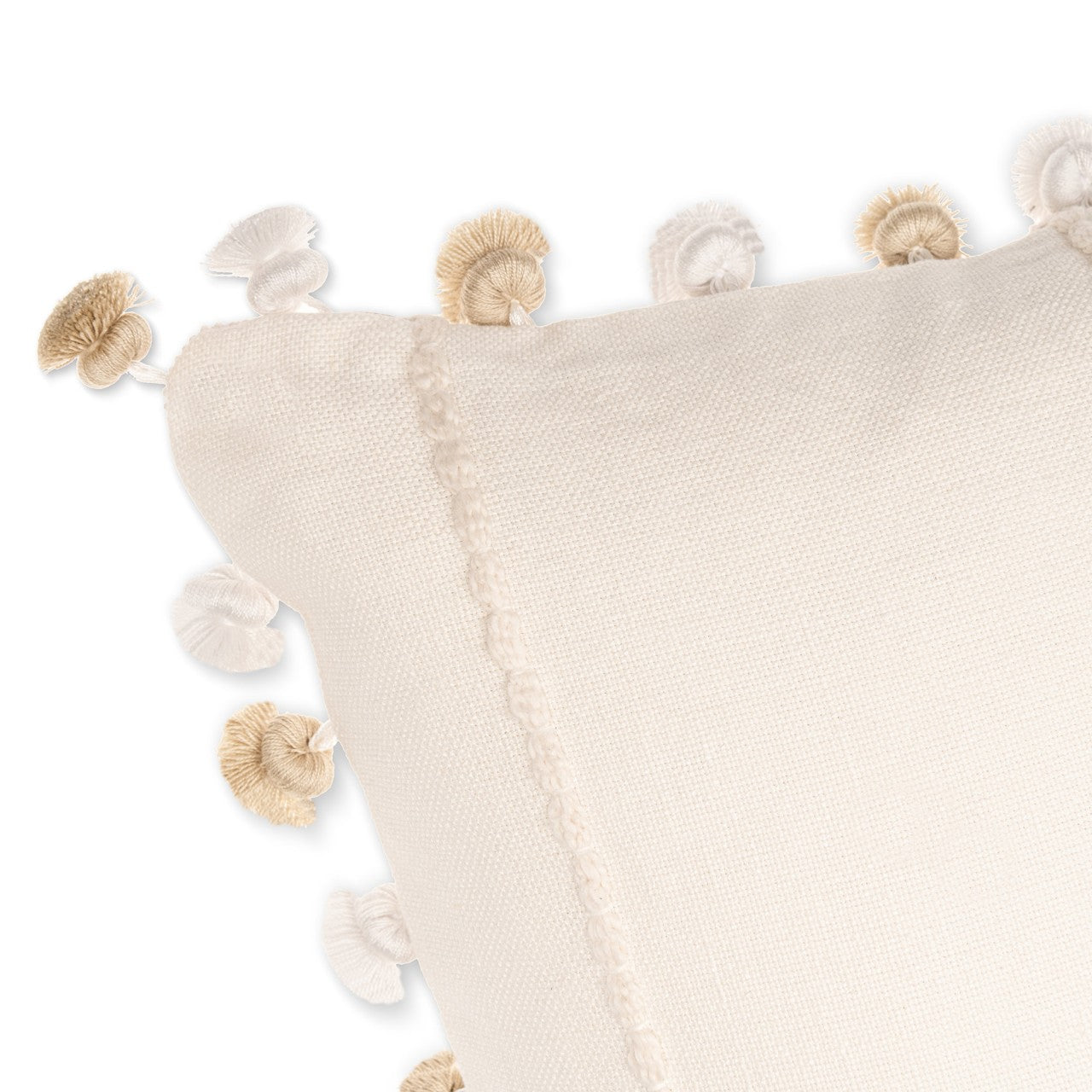 Pretty and delicate, this soft cotton/ linen mix cushion features a fine, crochet-style line and is edged in white and beige tasselled trim. The ideal companion for bolder designs, it’s a versatile piece that works well in any room bringing comfort and cosiness.