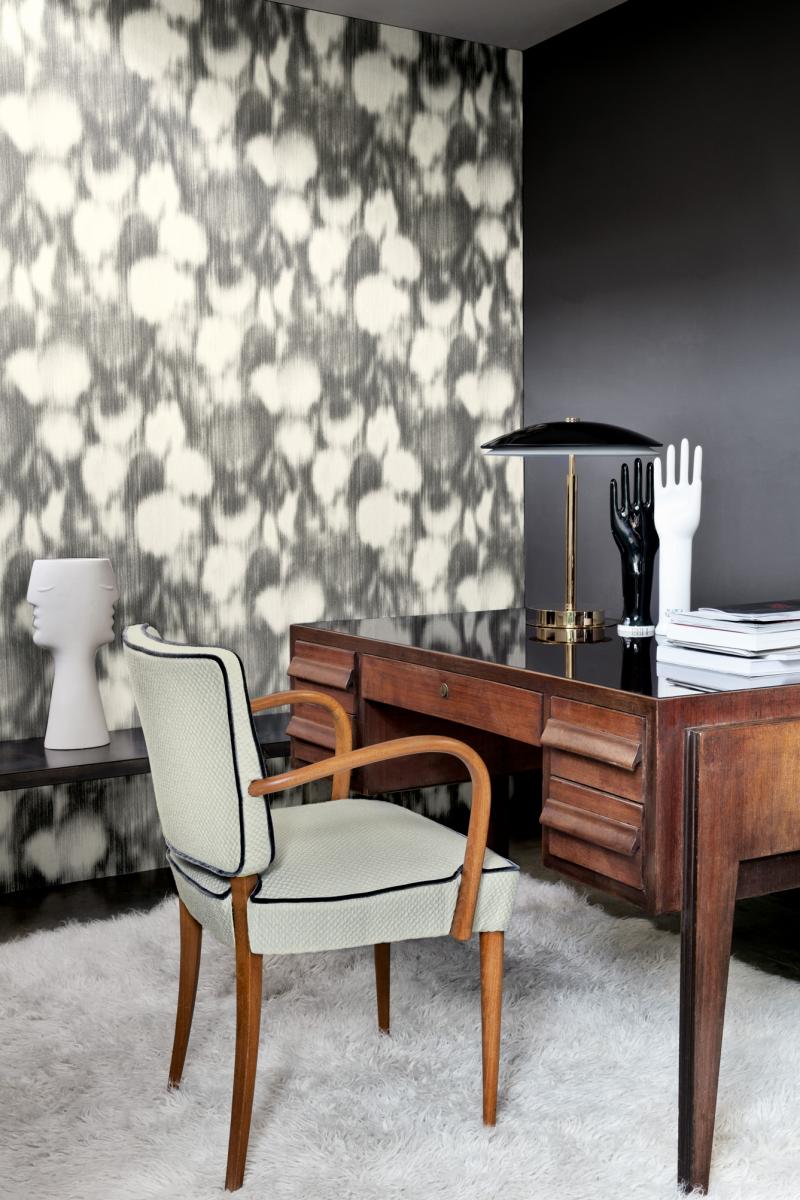 Mirabilis Wall has a decorative pattern with large stylised flowers printed on a fil posé ground. The warp threads glued onto paper create a chiné perception of the pattern. Mirabilis Wall is available in 3 colours.