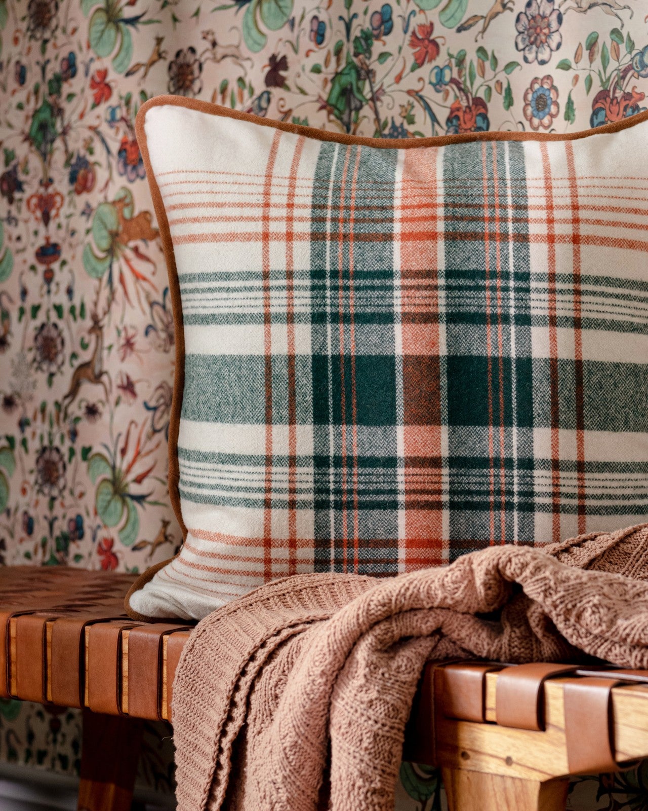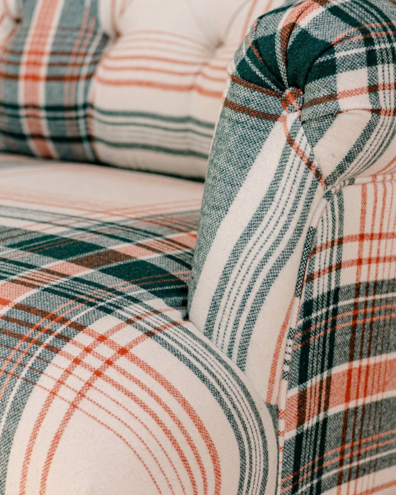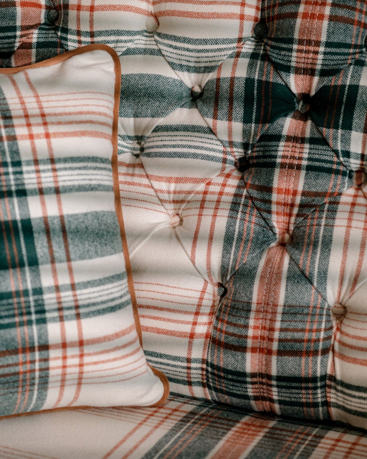 Referencing the pop music festival which took place in 1967, MONTEREY PLAID stands out with terracotta stripes contrasting the white and green shades alongside it. The woven fabric brings a softer and more structural aesthetic to the Woodstock collection, pairing well with bolder colours and prints as seen within the fashions of the era.