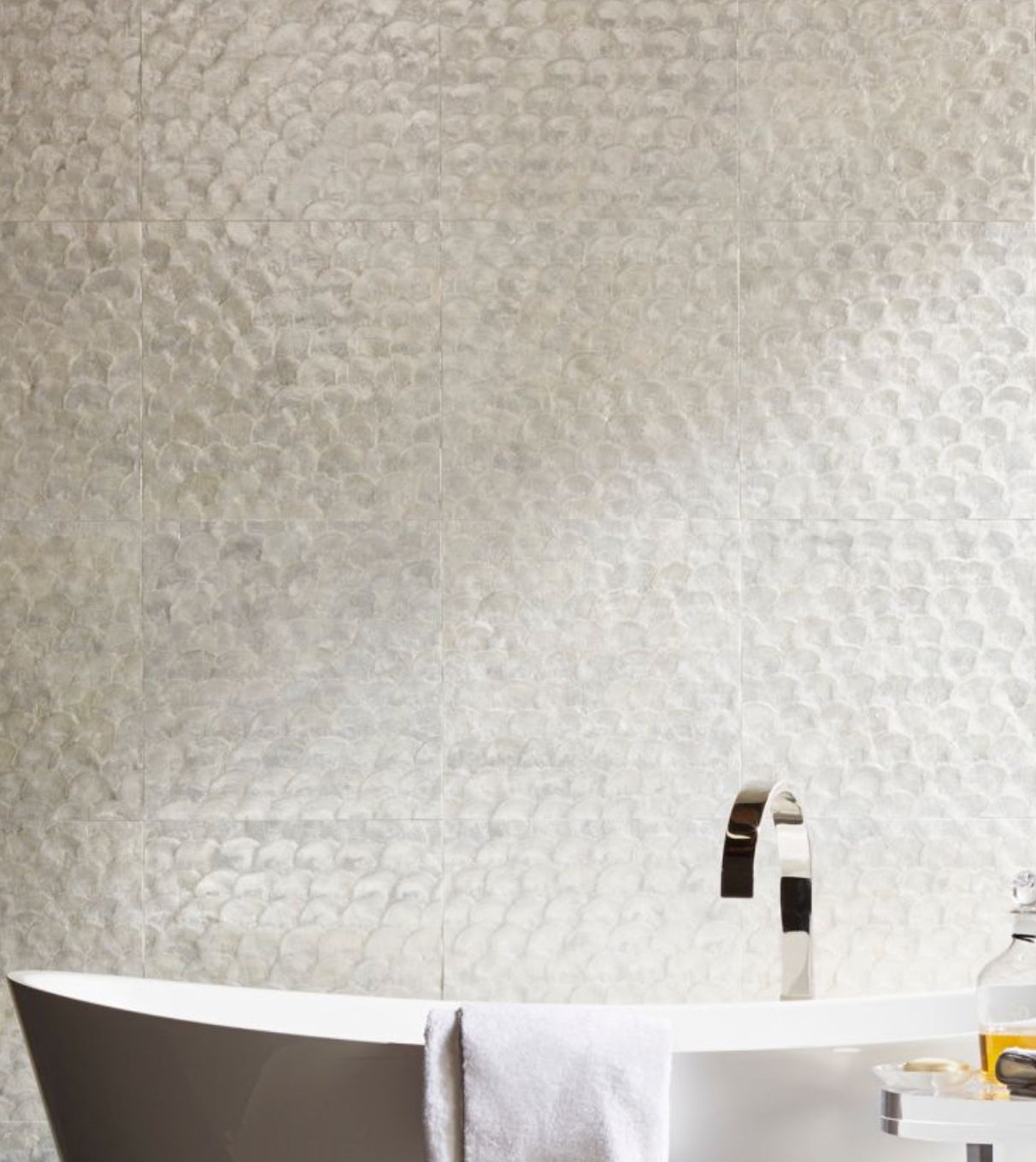 Flexi Mother of Pearl Aphrodite is a hand‑crafted, flexible veneer of layered round capiz shells, with a stain‑resistant coating. Edges of each tile are scalloped to disguise seaming. Thinner and more flexible than the original, Flexi Aphrodite turns corners and wraps columns with ease, even at an extremely tight radius.