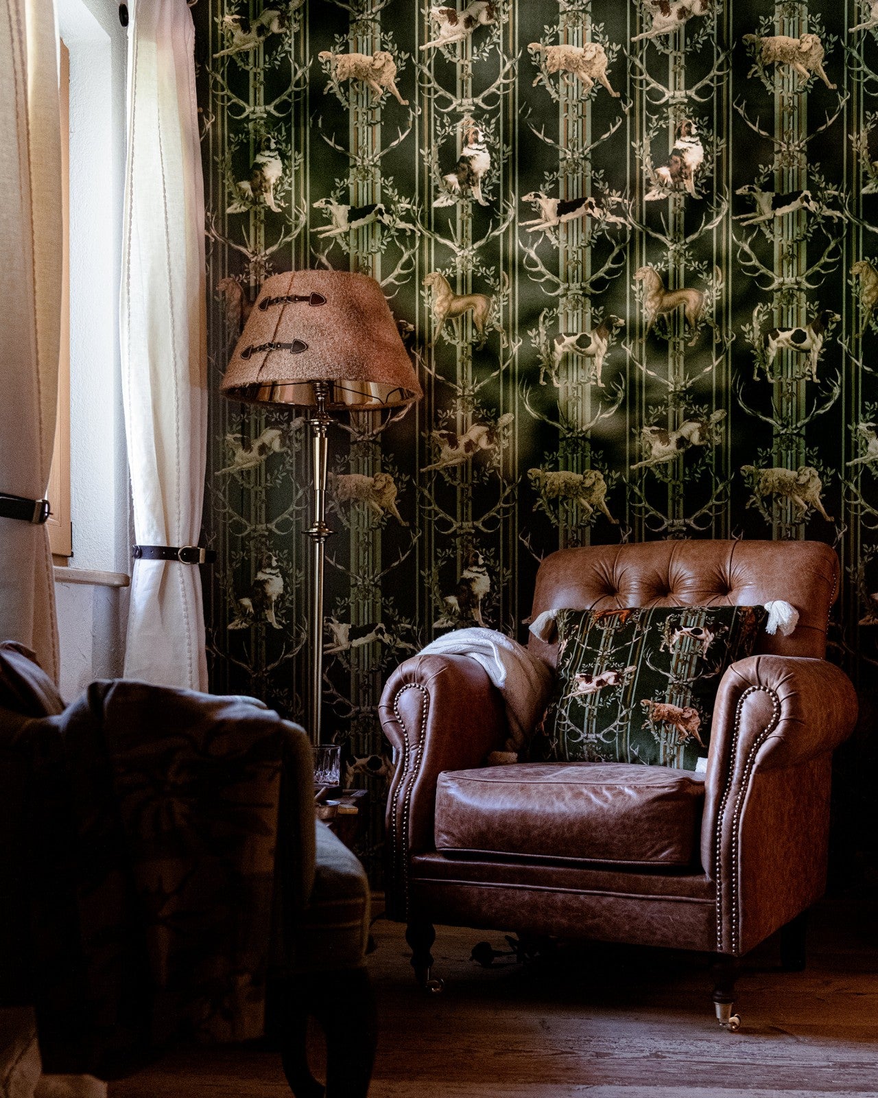 Loyal, agile and intelligent, there is a reason why alpine dogs are so famous among worldwide breeds. This playful pattern celebrates the spirit of those faithful companions with a pair of noble hounds leaping across a striped background. Leafy garlands, majestic antlers and a smart stripe come together to complete the handsome MOUNTAIN DOGS design.