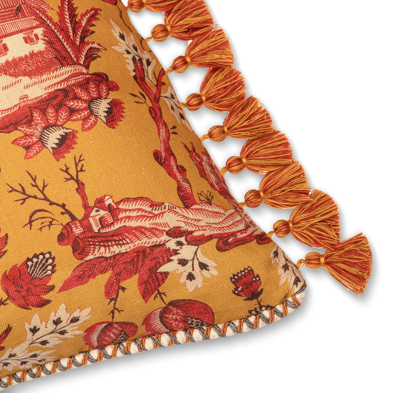 The golden colourway of this uplifting cushion makes it a sunny addition to any sofa of chair. Crafted from NAMLOS linen fabric that illustrates the Tyrolean mountain life, it’s edged with plush fringing as well as crochet piping, all of which make it a truly striking accessory.
