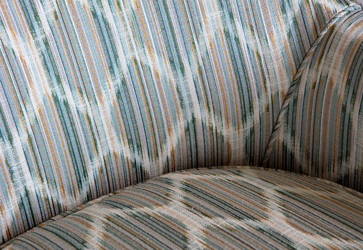 Woven on a high-density nylon warp, vertical multicolored dashes create the feathered ogee shape of this sophisticated upholstery fabric. Behind the ogee motif is a fine ribbed structure that adds an unexpected element to this traditional pattern.