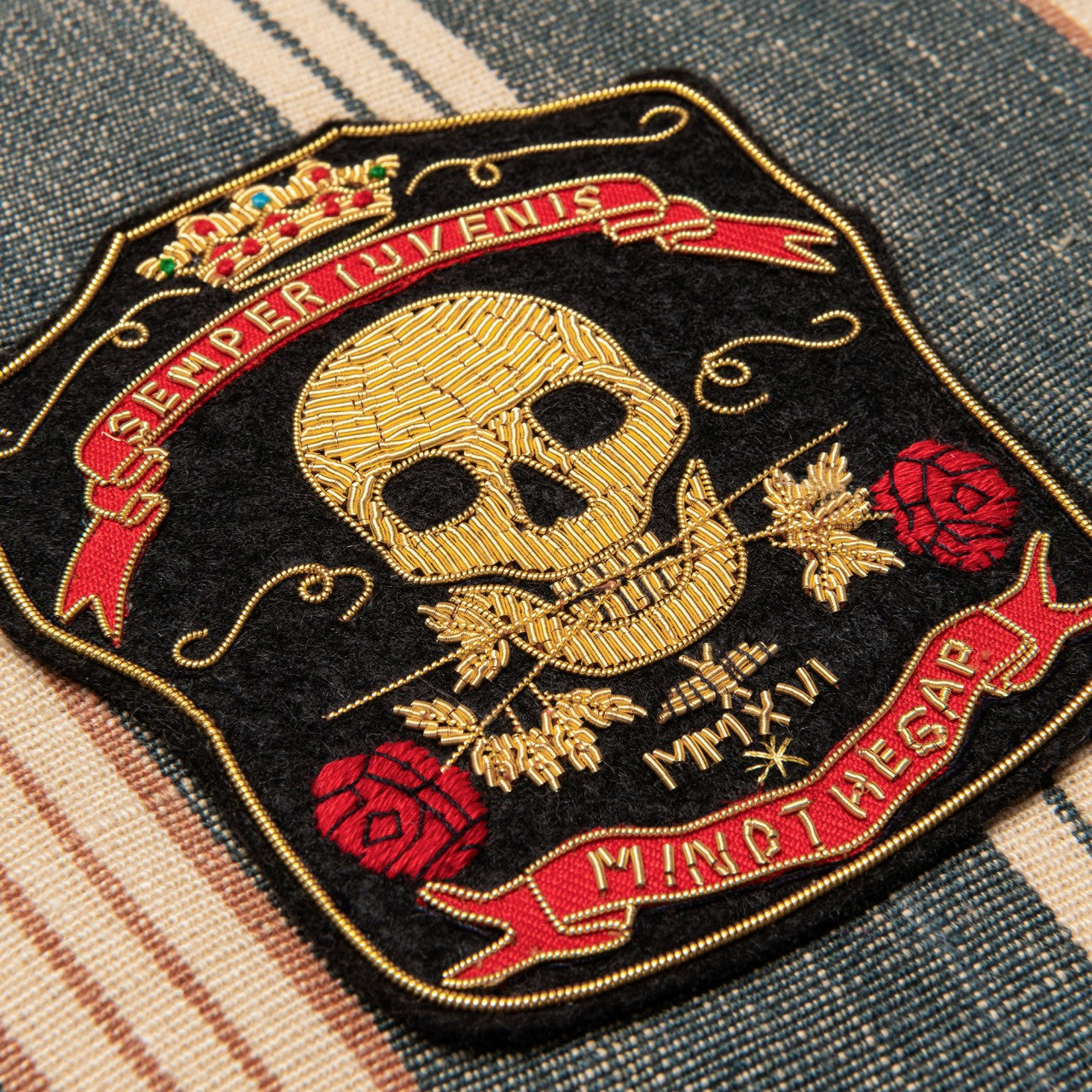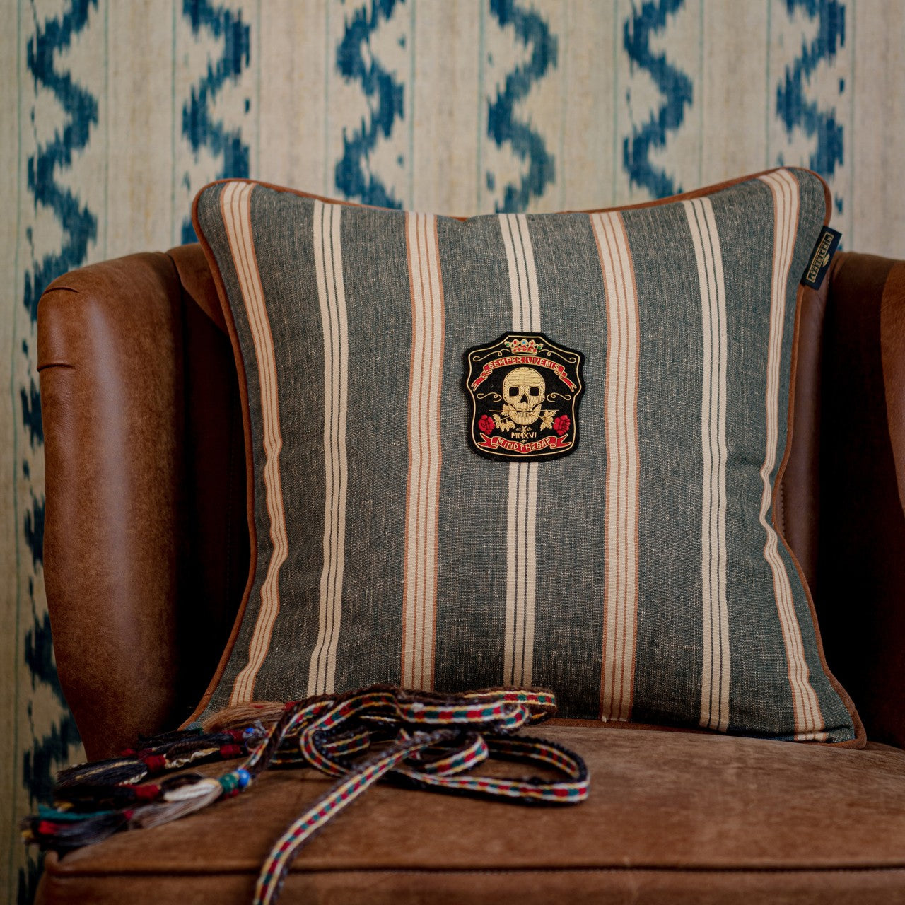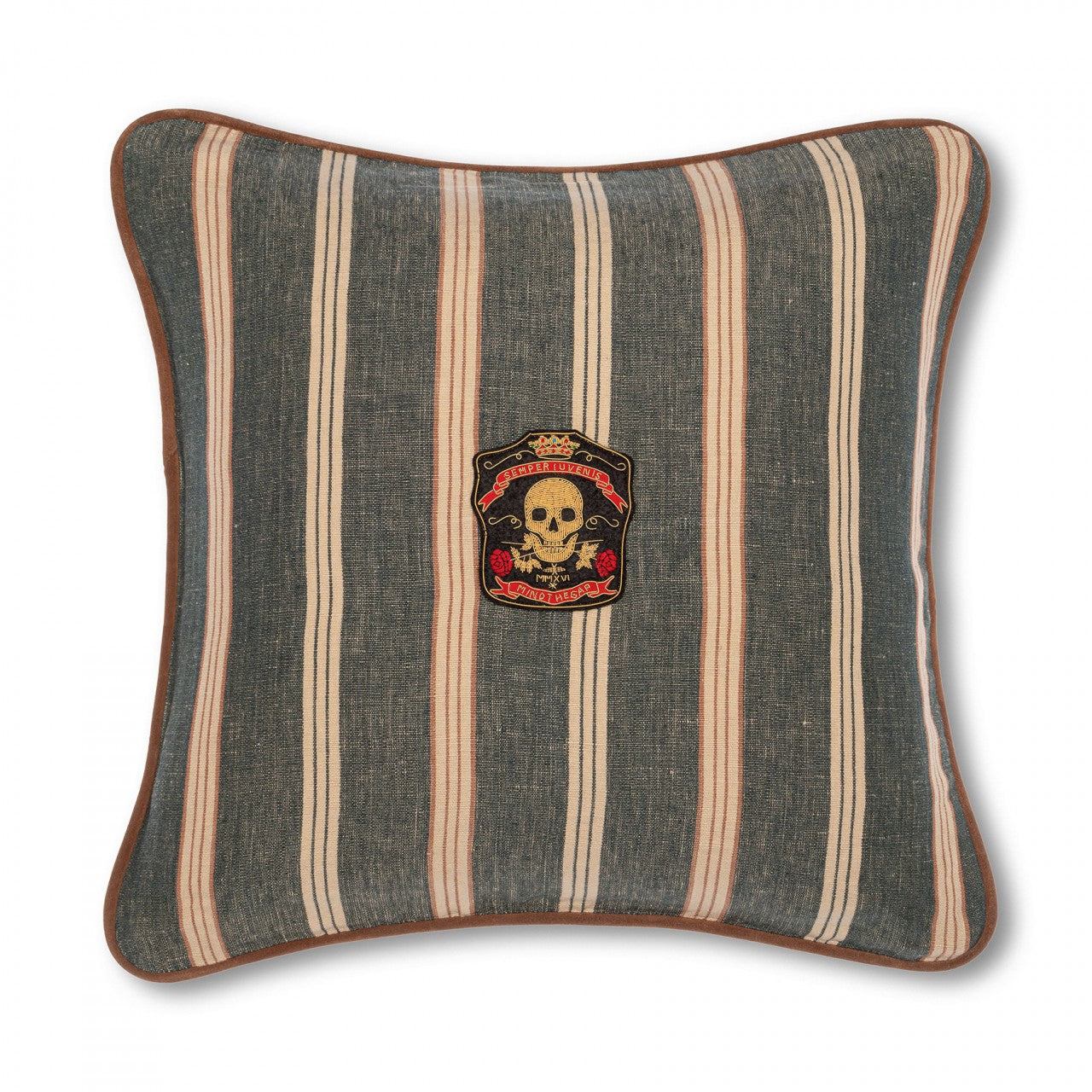 Referencing Vortex I, the rock festival held in Oregon in 1970, the OREGON STRIPES woven linen cushions show a colour palette which embodies the stonewashed denim fashion of the era. The Denim Washed and Orange Washed striped linen cushions are complemented with a brown leather piping, that enhance the premium look of the product. The front cover is decorated with a beautiful hand-embroidered metallic bullion displaying a skull and two roses representing the main symbol of the Woodstock Collection, Semper Iuvenis.