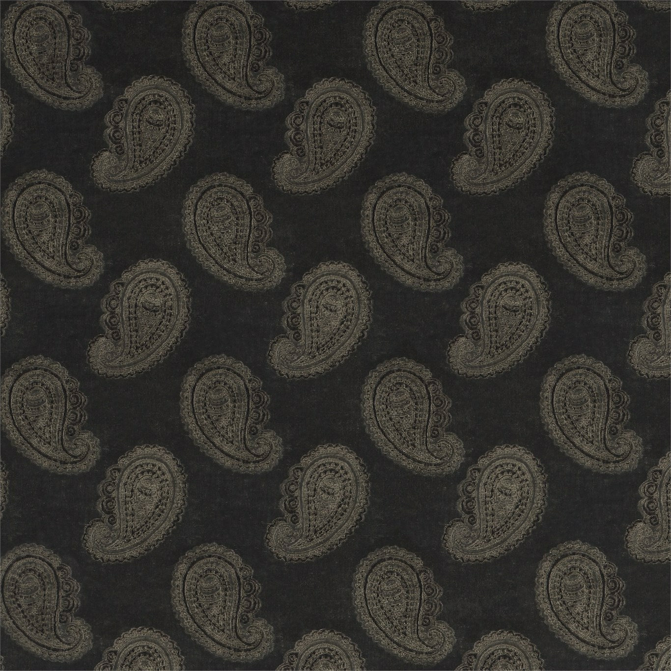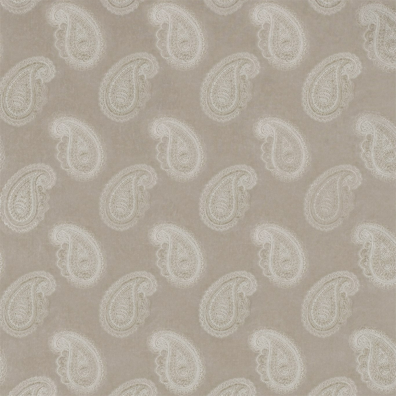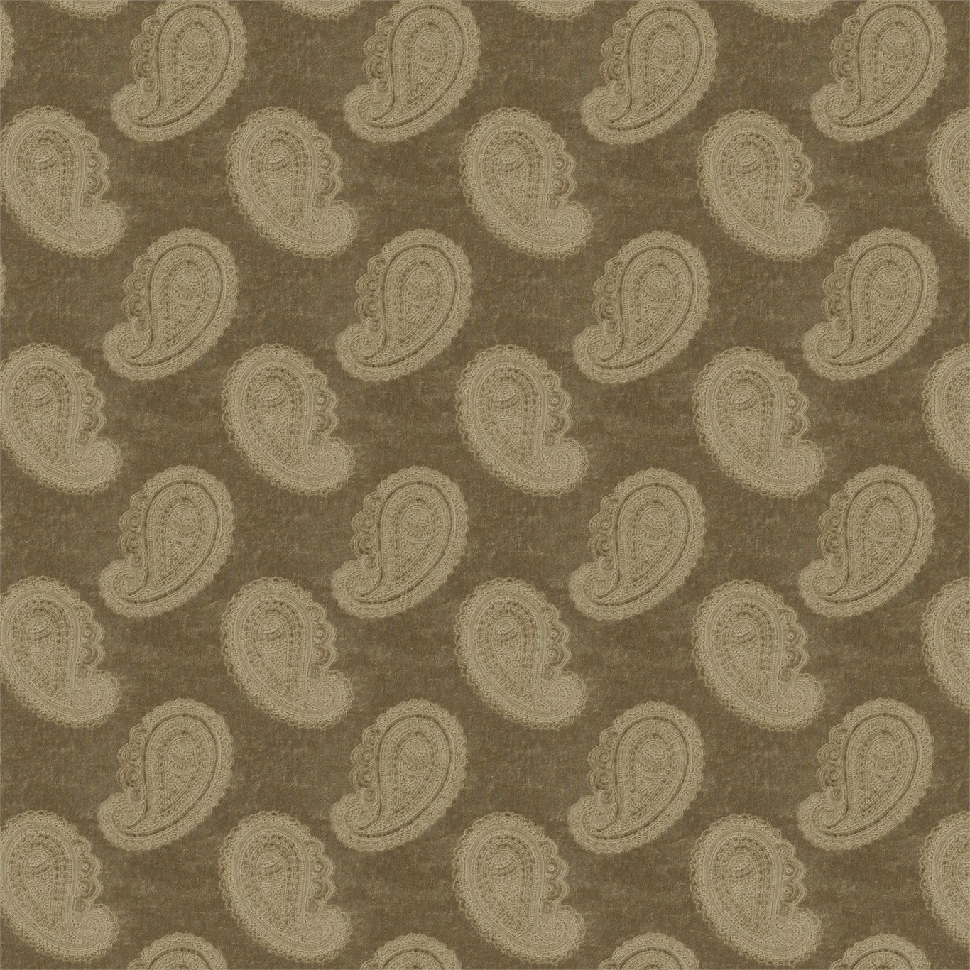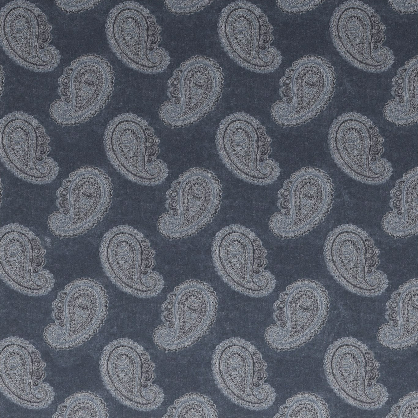 A mid-scale finely embroidered paisley motif sits upon a lustrous semi-plain velvet cotton-blend fabric. Woven with two viscose yarns in the pile enhanced by a texture reminiscent of beaten metal, this opulent upholstery fabric is available in jewel-like colourways, .