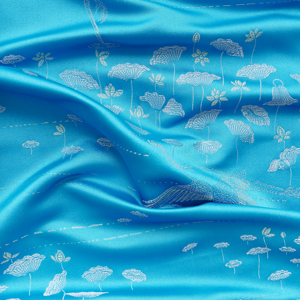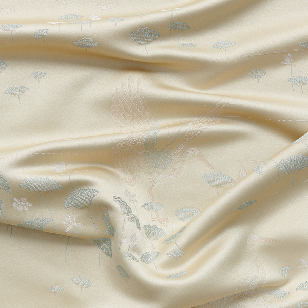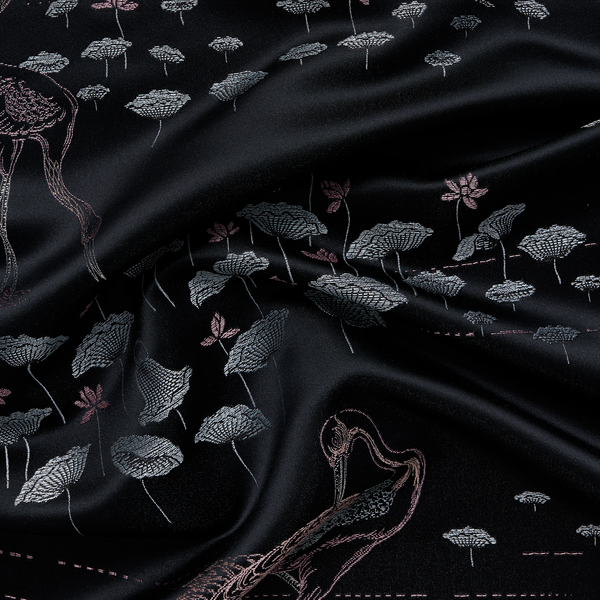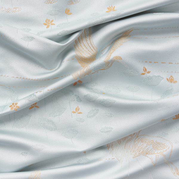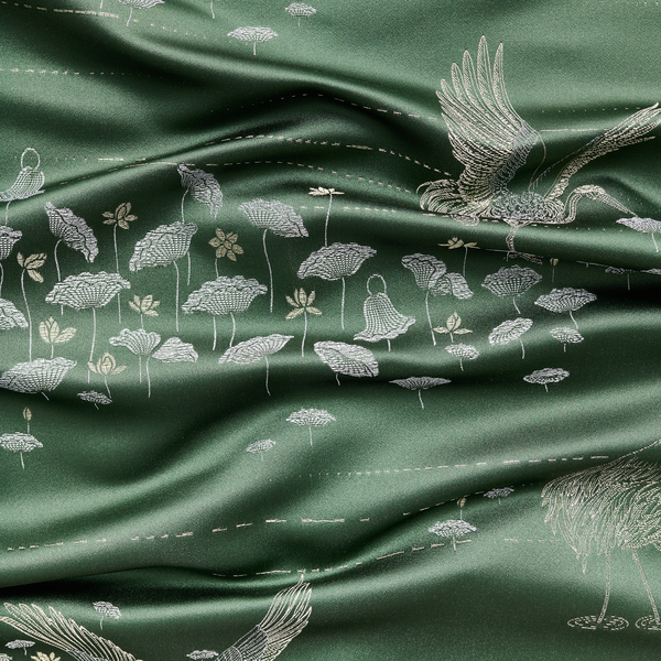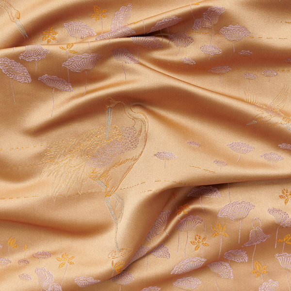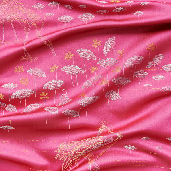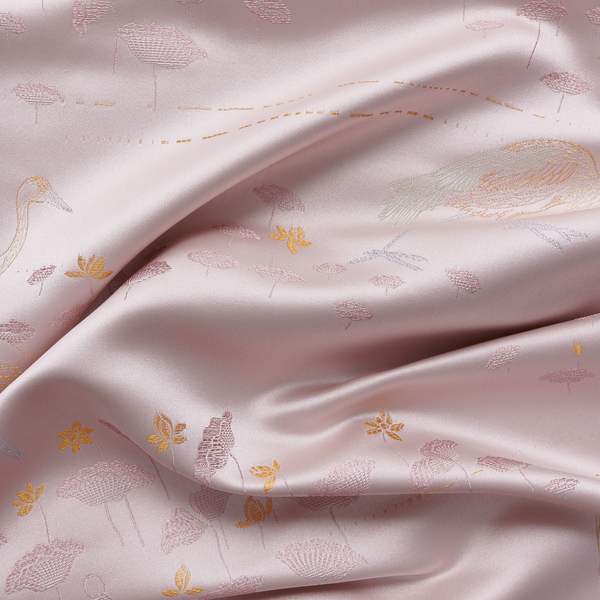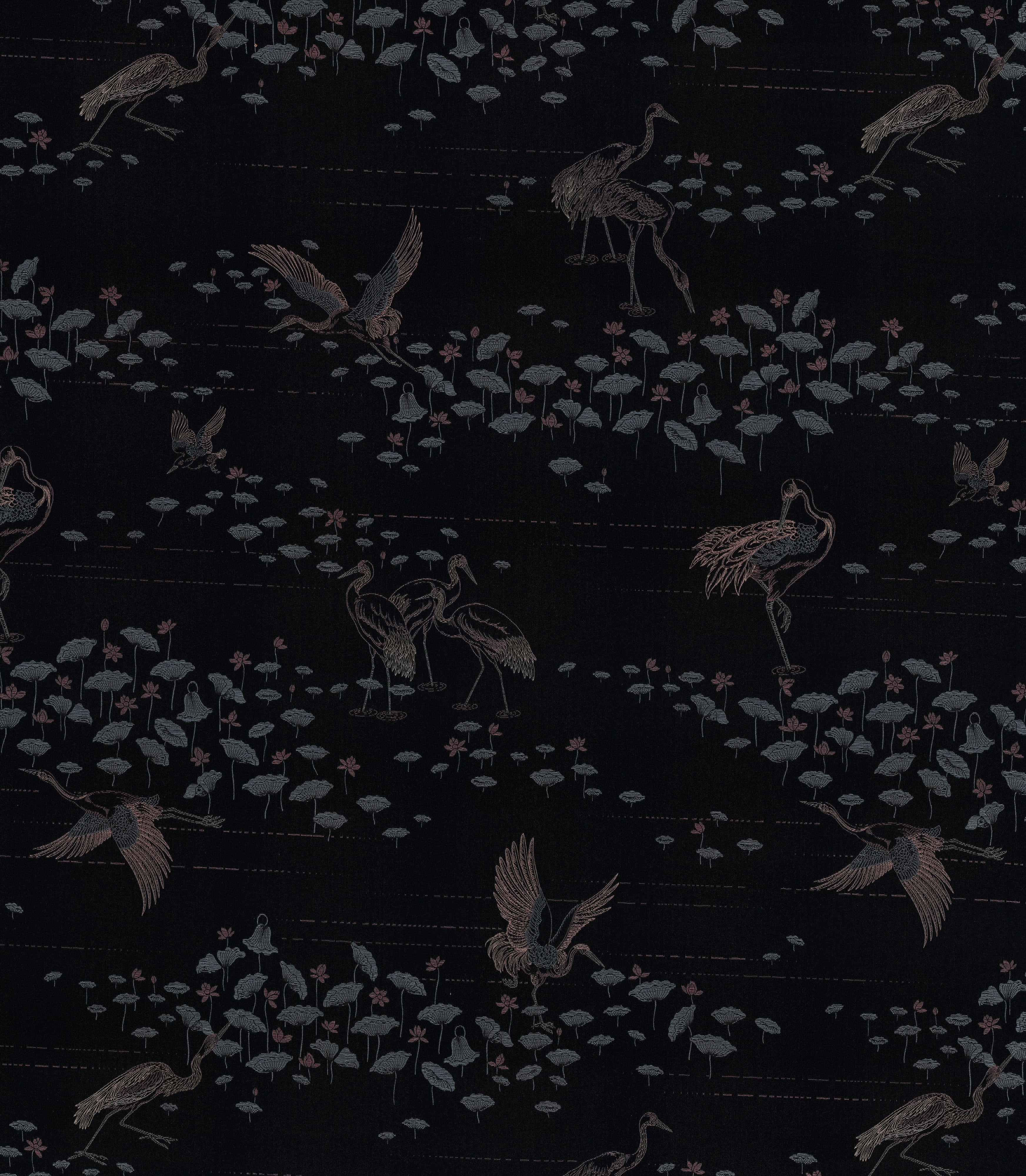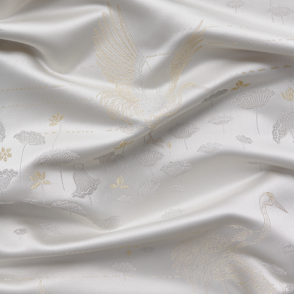 Inspired by Japanese miniatures painted on textiles and ancient kimonos, Otori is an exotic jacquard drape, dreamlike and dissonant in its colouration. Lotus flowers and leaves, herons still or in flight, shimmer on the sateen surface, almost cold to the touch like the water of the pattern. Colours are deliberately off-kilter, raspberry pink with orange, silver with buttery off-white and pearl white with icy grey.