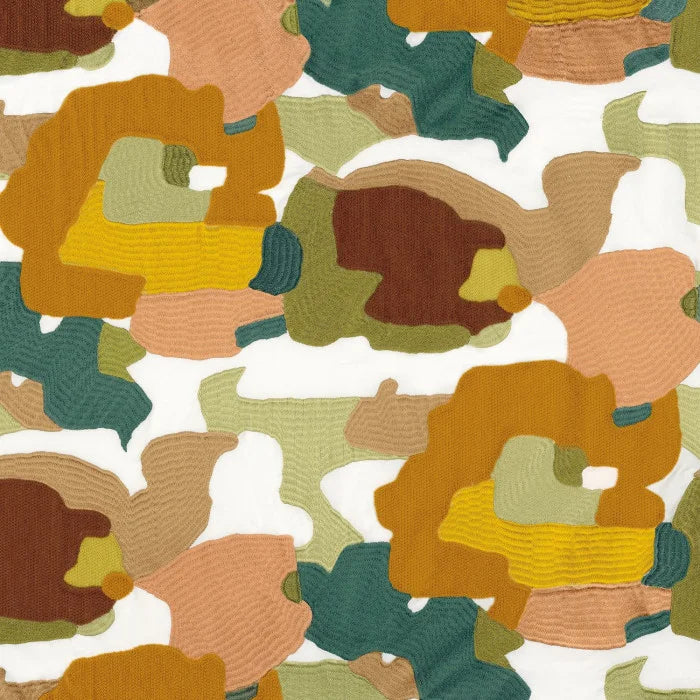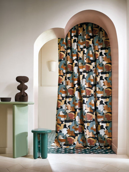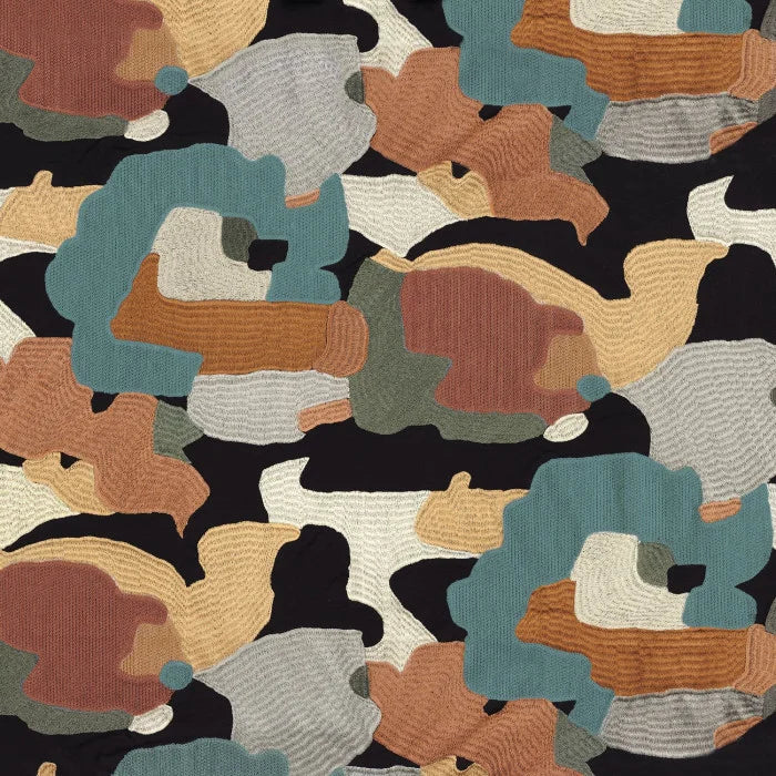 PARADE” is the abstract depiction of blooming flowers. Richly embroidered, its colors cover the soft cotton satin. Two embroidery techniques are used for its creations. One, using viscose yarn, illuminates the picture with delicate shine. The other adds a matte contrast with the woollylook acrylic yarn. Embroidered in chain stitch it adds a noble touch to the fabric.Available on a black or white cotton-satin, PARADE is available in four colorways.