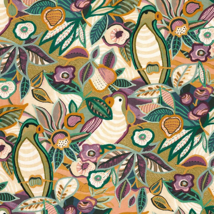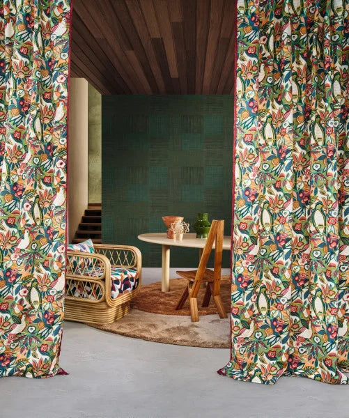 In a cloud of flowers and birds, we discover the magic of Pico Bonito,a park in central Honduras. Printed on a cotton and linen base, the flowers and birds are embroidered with an acrylic yarn. The embroidery heightens the colour contrast on the outlines of a patral or the veining of a leaf and gives the fabric a luxurious drape.