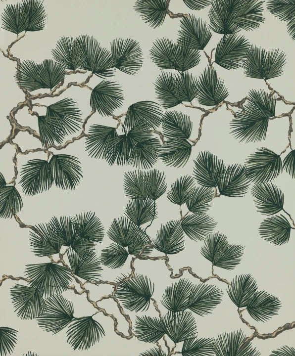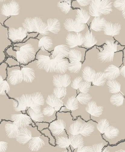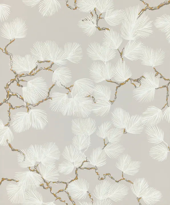 Pine grey is a wallpaper depicting branches of pine in white on a grey background. In Japan, the pine symbolises long life, honour and youth. The tree can stand tall over centuries and stay green all year round with its lacy feathers, despite bitter coldness and snow. In our pattern, the pine’s branches cover the wall in a light, large-patterned dance. Vivid, with serenity. Wallpaper Pine is part of our collection Nippon and is available in two other colourways.