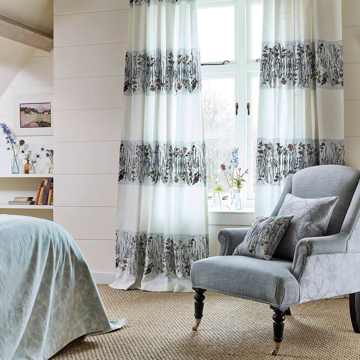 An intricately embroidered linen-mix fabric of delicately pressed flowers positioned on to a wide horizontal stripe. A perfect contemporary addition to the modern country home.