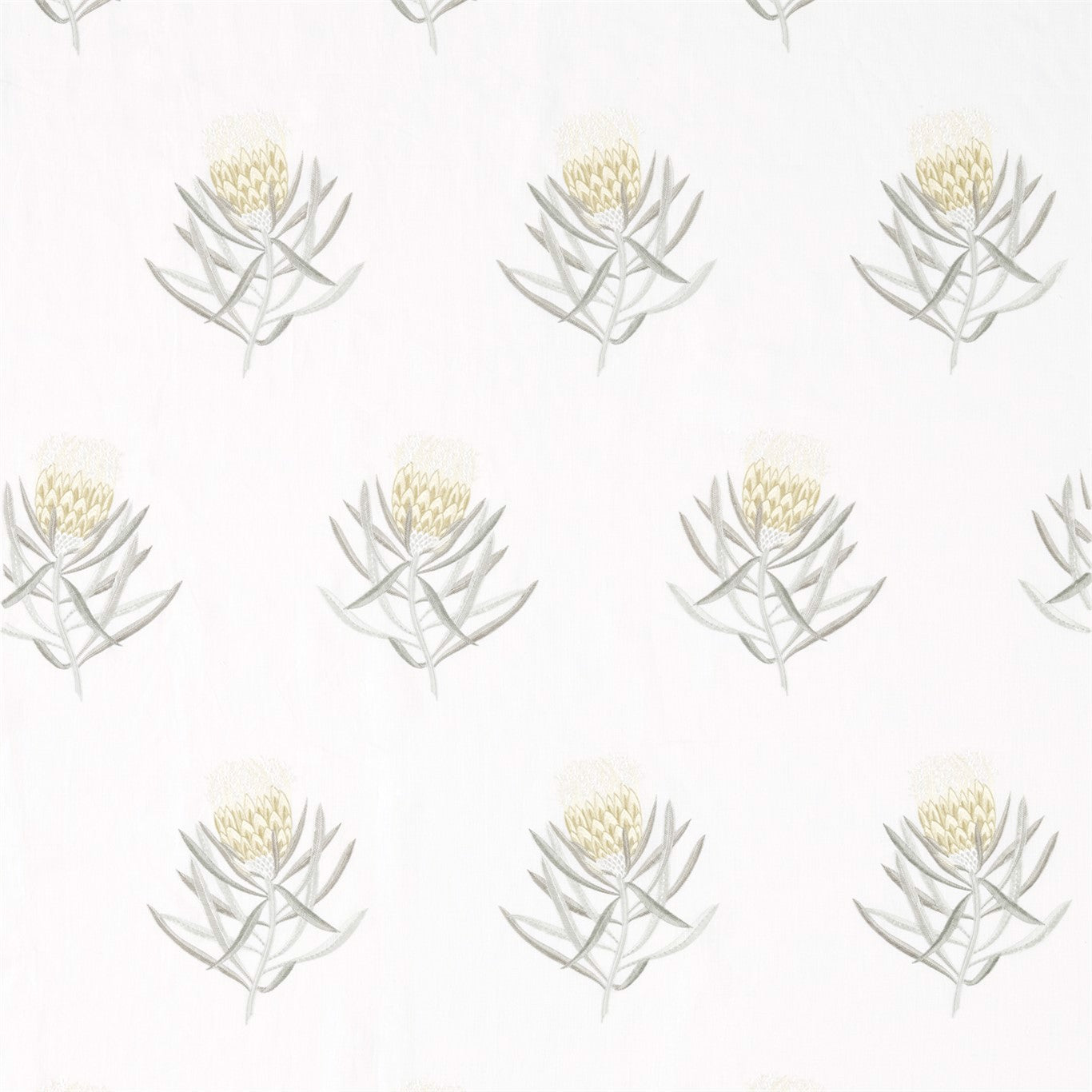 Symbolising diversity, courage and strength, perfectly placed protea flowers are embroided on a linen-mix fabric background in neutral colourways. A wallpaper of the same name is also available.