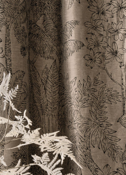 Composed of fine materials such as linen and silk, Ramage combines elegance and finesse.The delicate outlines of frangipani flowers and foliage are created using a viscose yarn. Its shine contrasts with the natural fabric, bringing the shadows and highlights to life. Designed for making curtains, this jacquard gives them a remarkably supple drape. And, we can almost imagine the floral fragrance escaping from the fabric.
