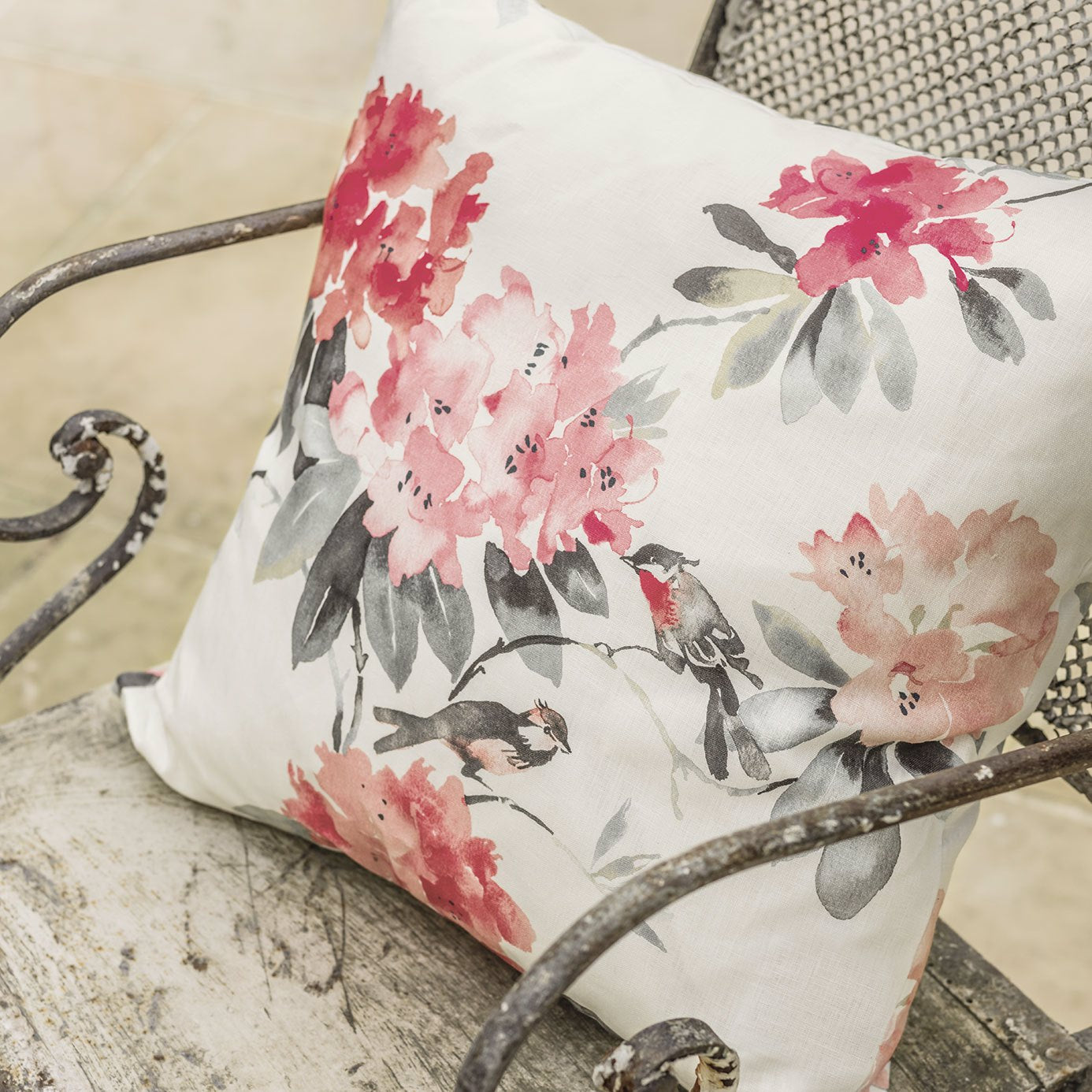 Pretty birds perch amongst flamboyant rhododendron leaves to create a botanical fabric design produced on 100% linen, bringing both drama and feminine beauty into the home and produced in vibrant colourways.