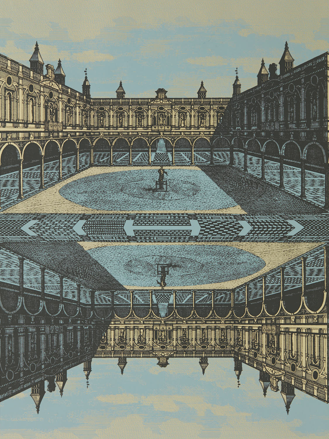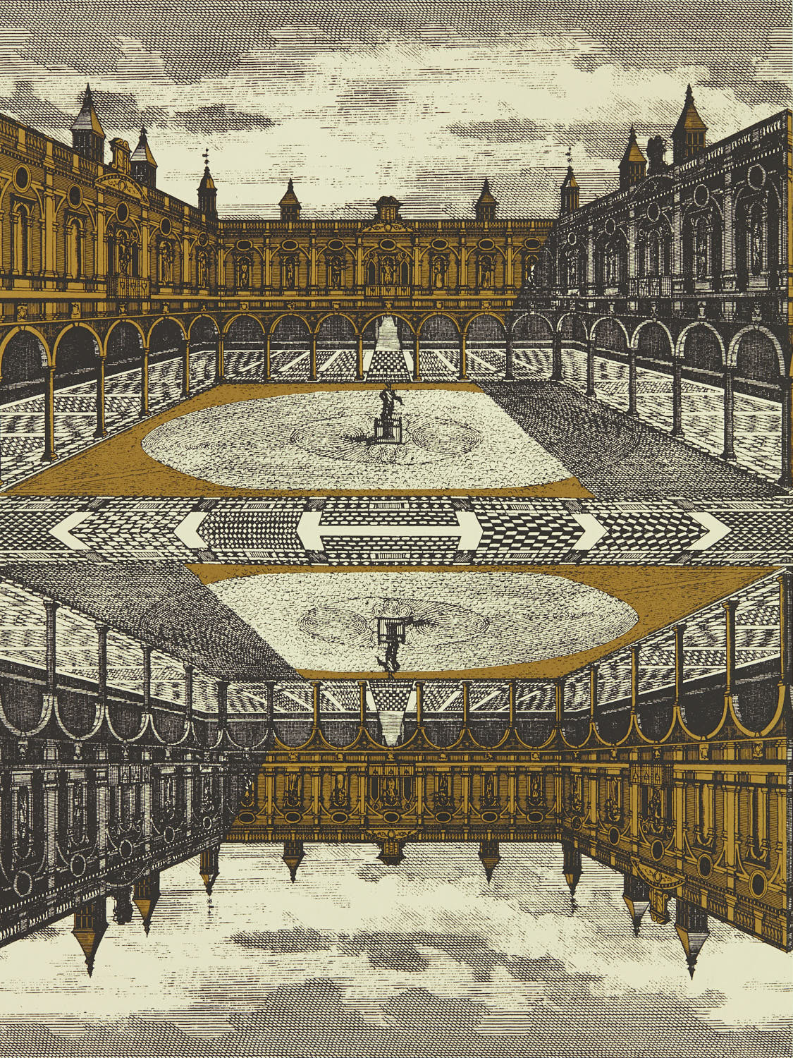 Atmospheric and opulent, this captivating paper displays a dramatic and iconic scene. Designed in 1965 by Robert Nicholson and originally hung horizontally, we believe a famous 1644 Wenceslaus Holland etching of London’s Royal Exchange inspired the design. The addition of a shimmering Gold represents the wealth of Exchange Square.