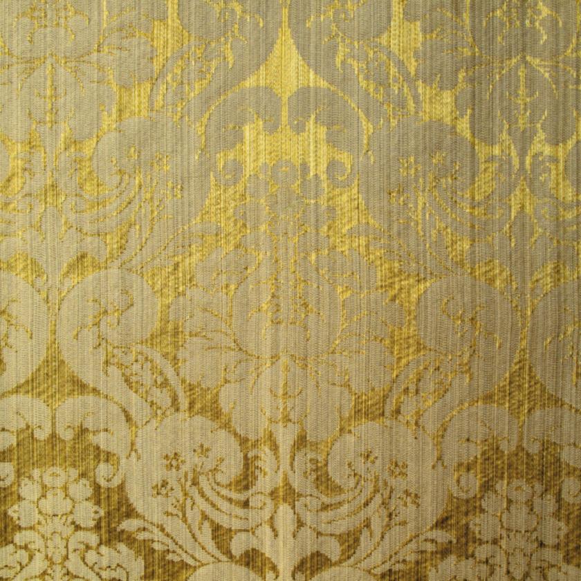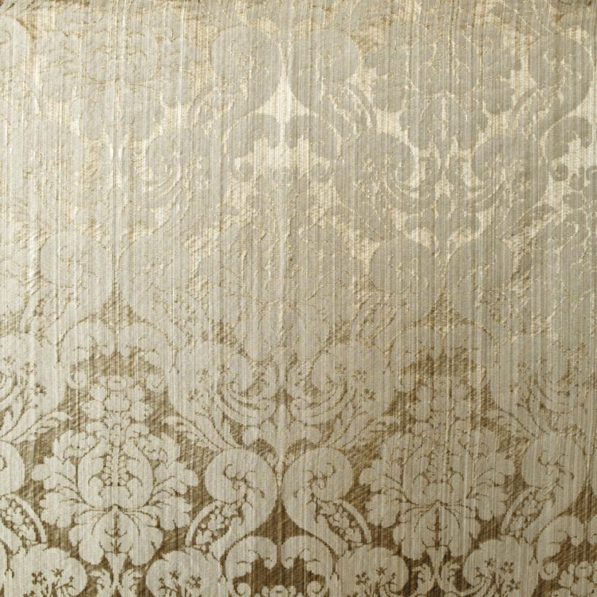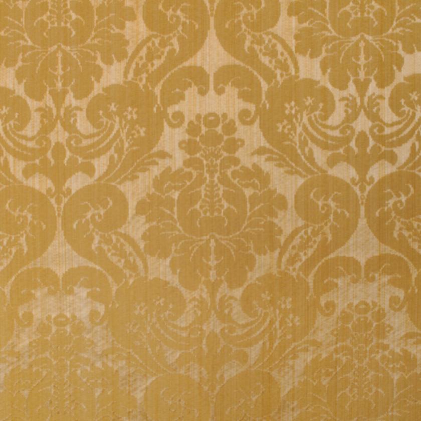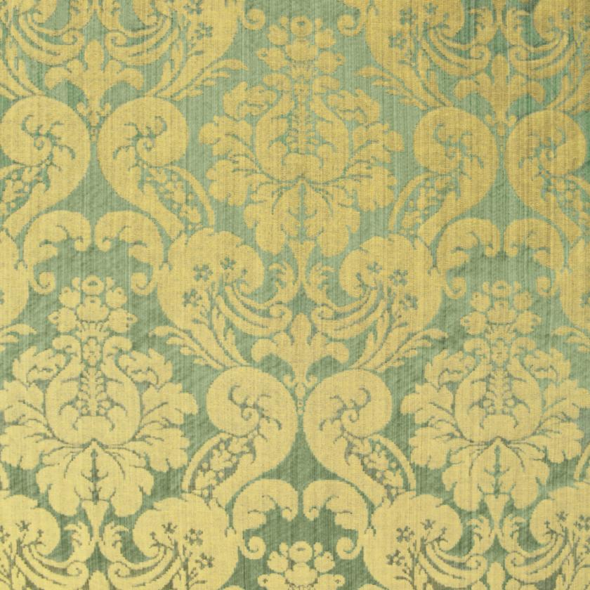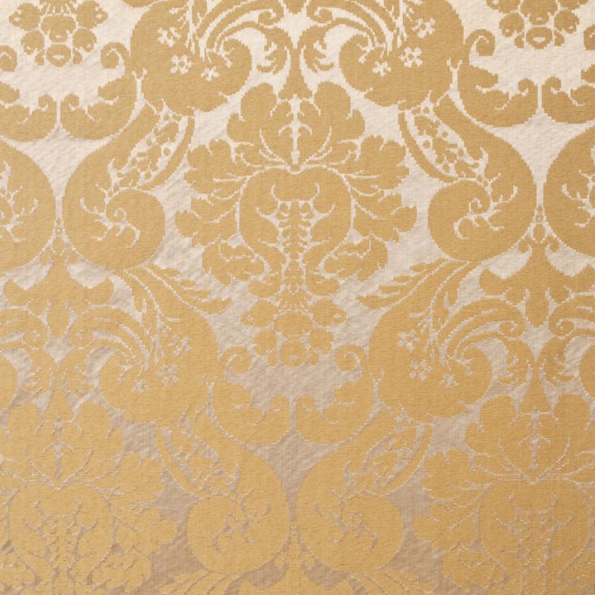 Silk with ground elegantly marked out by striated effects on which decorations of flowers and rich foliage are structured, creating graceful ogival shapes. In this two-colour damask the pattern stands out against the ground thanks to the use of shiny linen and acetate wefts. The characteristics of the warp and weft yarn in fact give a special and luxurious light to the fabric. The palette consists of as many as thirteen colours, ranging from shades of green to gold and finally neutrals.