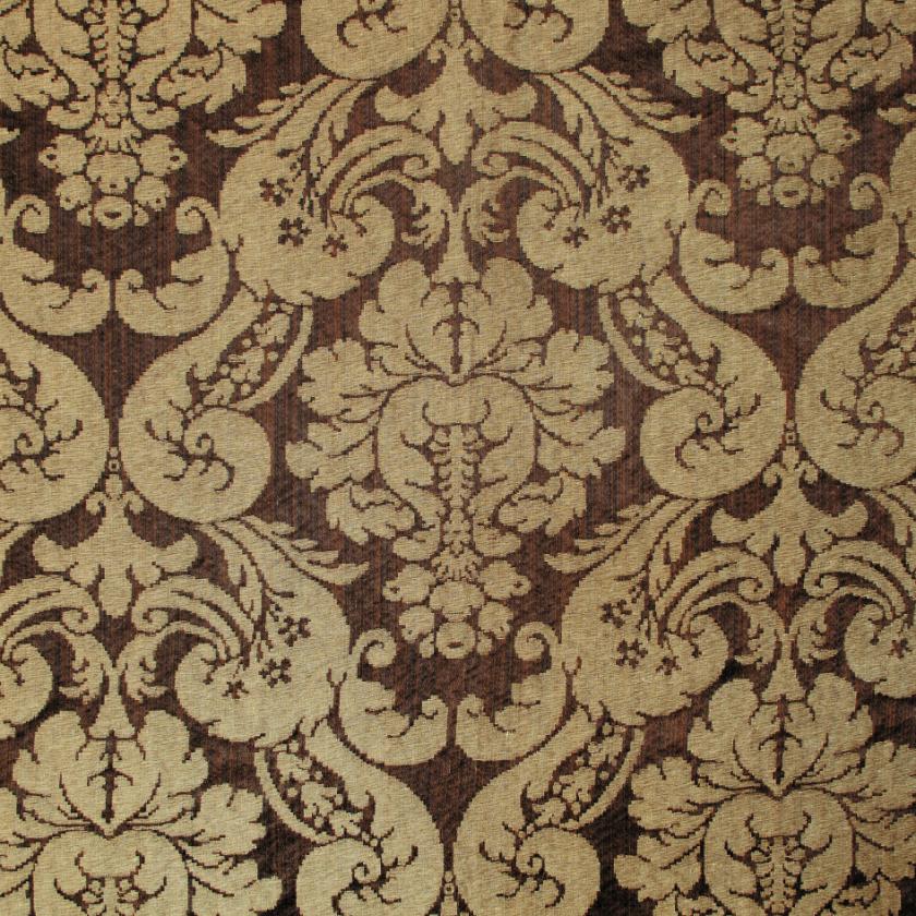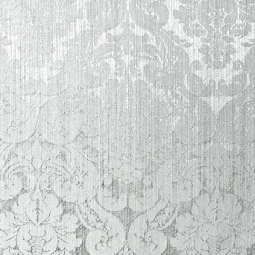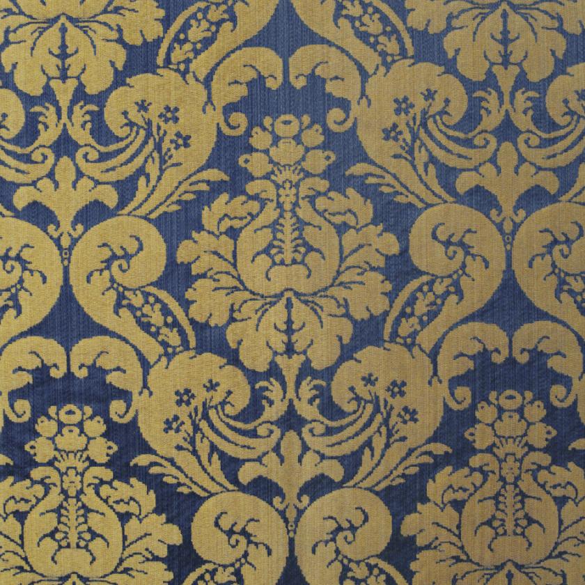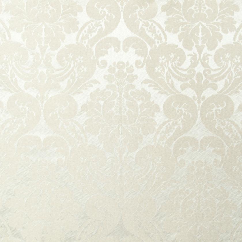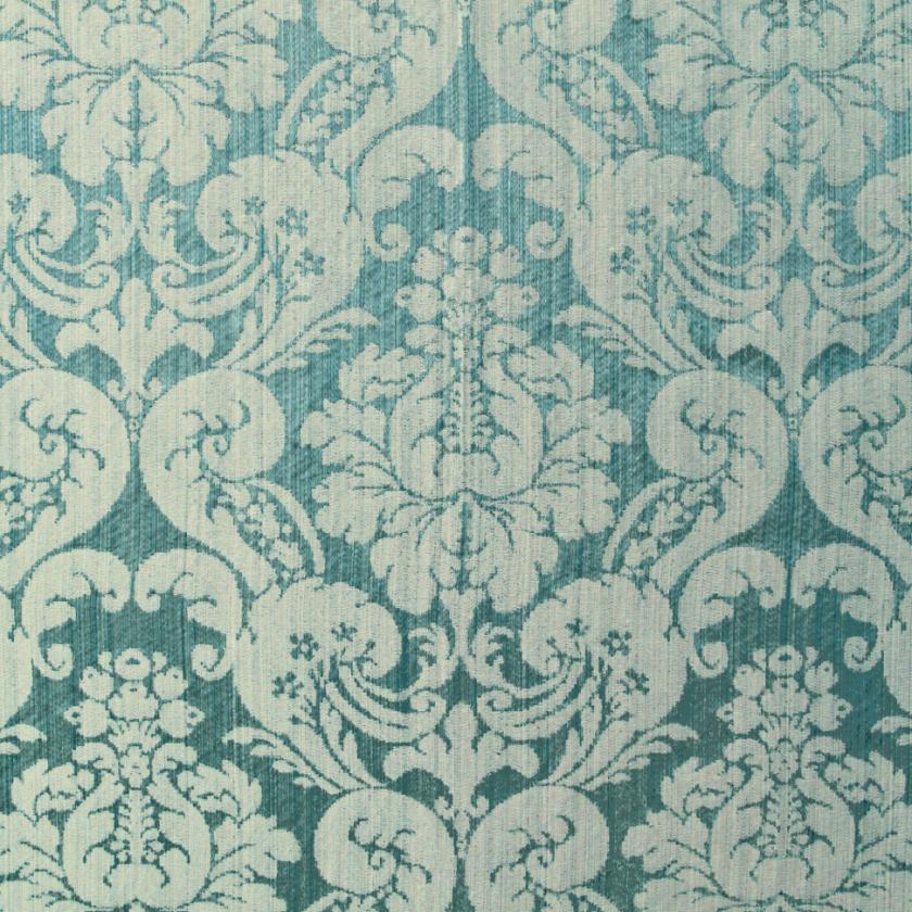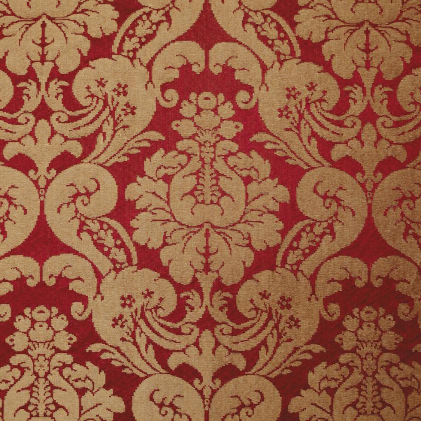 Silk with ground elegantly marked out by striated effects on which decorations of flowers and rich foliage are structured, creating graceful ogival shapes. In this two-colour damask the pattern stands out against the ground thanks to the use of shiny linen and acetate wefts. The characteristics of the warp and weft yarn in fact give a special and luxurious light to the fabric. The palette consists of as many as thirteen colours, ranging from shades of green to gold and finally neutrals.
