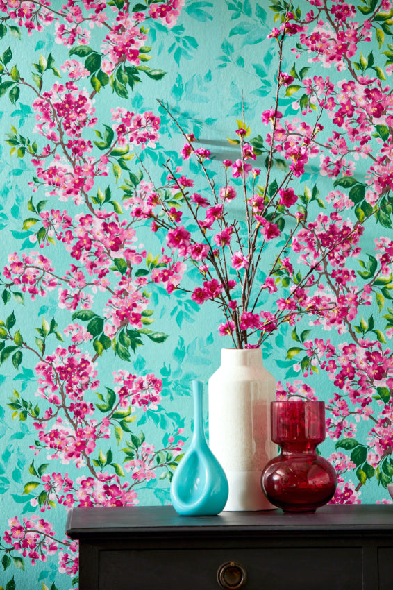 Nothing says springtime like blossom! This gorgeous trail leads outwards from a central stem surrounded by diffused leaves on a coloured ground. Hand-painted in watercolour and with a lovely tonal movement, the design creates a soft modern stripe effect.