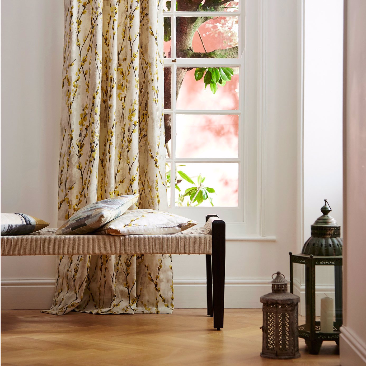 Fauvisimo - Salice. An abstract painterly interpretation of sprays of pussy willow printed on upholstery fabric with a grey background.