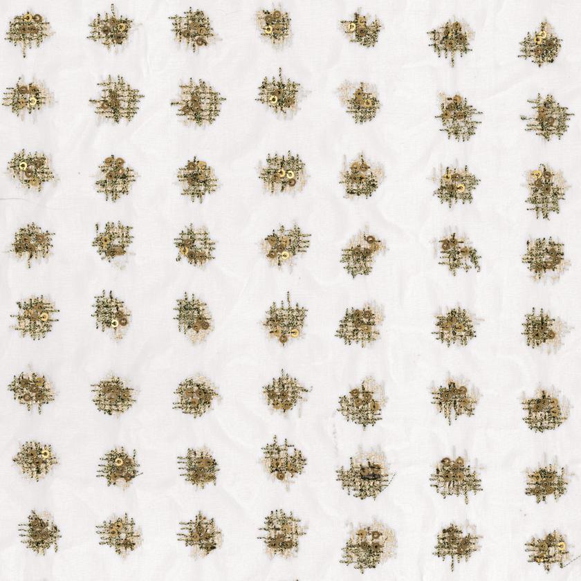 Silk organza embroidered with metallic yarns and sequins. The irregular polka dot pattern, rhythmically arranged on the sheer ground, combines geometry and randomness, since the source of inspiration is a handwovenikat fabric. Suitable for sheers.