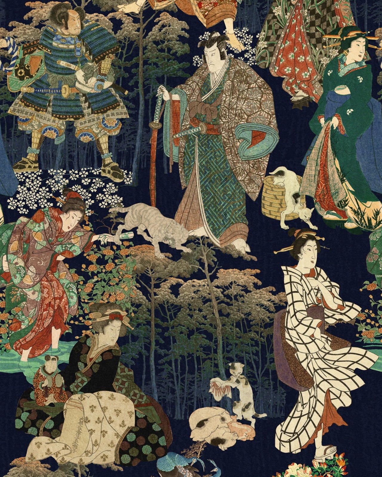 Intermingle with mighty warriors and elegant hostesses in the SAMURAI AND GEISHA wallpaper, which is alive with vibrant traditional Japanese characters emerging from a night-time forest. You’ll need to dress for the occasion – here each character is vivaciously adorned in wildly patterned, flowing kimonos, the artful drape of the fabric bringing decoration and movement onto the walls. From floral and nature inspired designs to geometric graphics and everything in between, each person is bedecked in an outfit worthy of most revered stylist, which in turn embellish the wall with their audacious patterns. Standing tall surrounded by swaying trees, sprawling flowers and striking wild animals, the prestigious figures shine brightly on a background of deep midnight blue.
