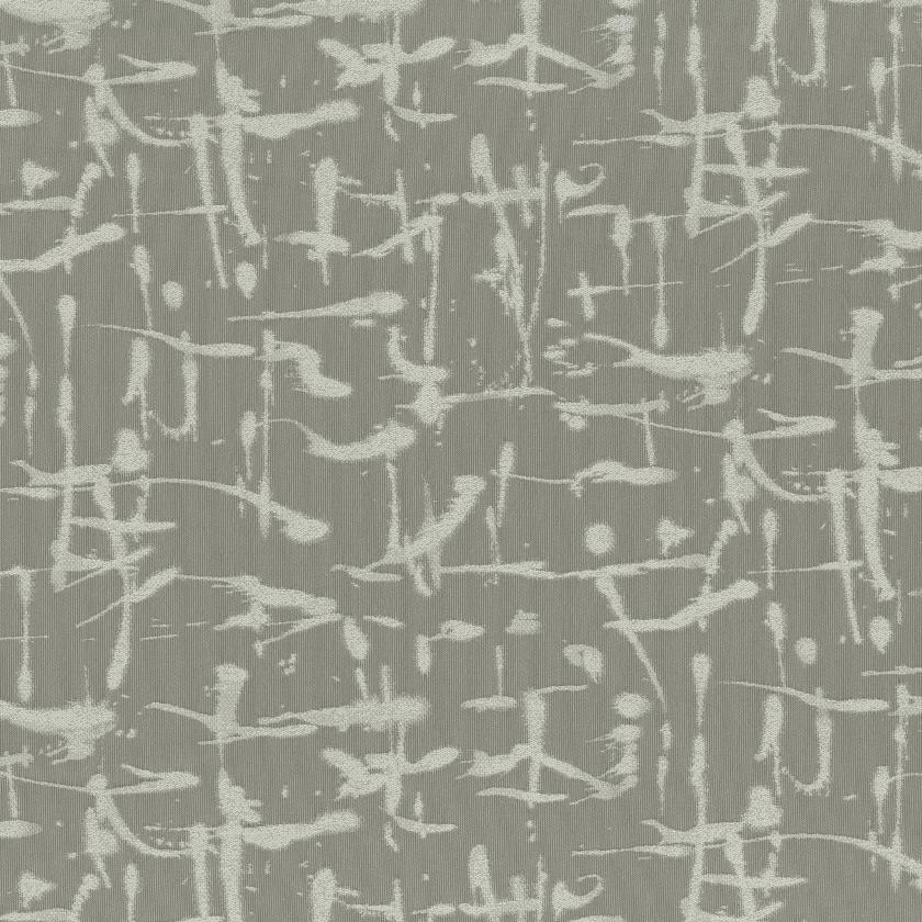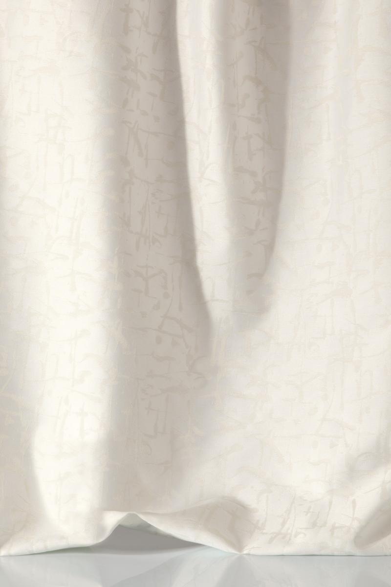 Textured curtain. A sort of mysterious score made up of free marks, like the notes produced by a saxophone. The marks, matte, stand out against the satin ground. A silky-looking curtain with a very appealing hand.