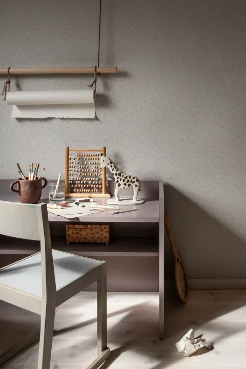 Decorative small patterned wallpaper with exquisite small hand-drawn forget-me-nots among foliage that can be seen on closer inspection.