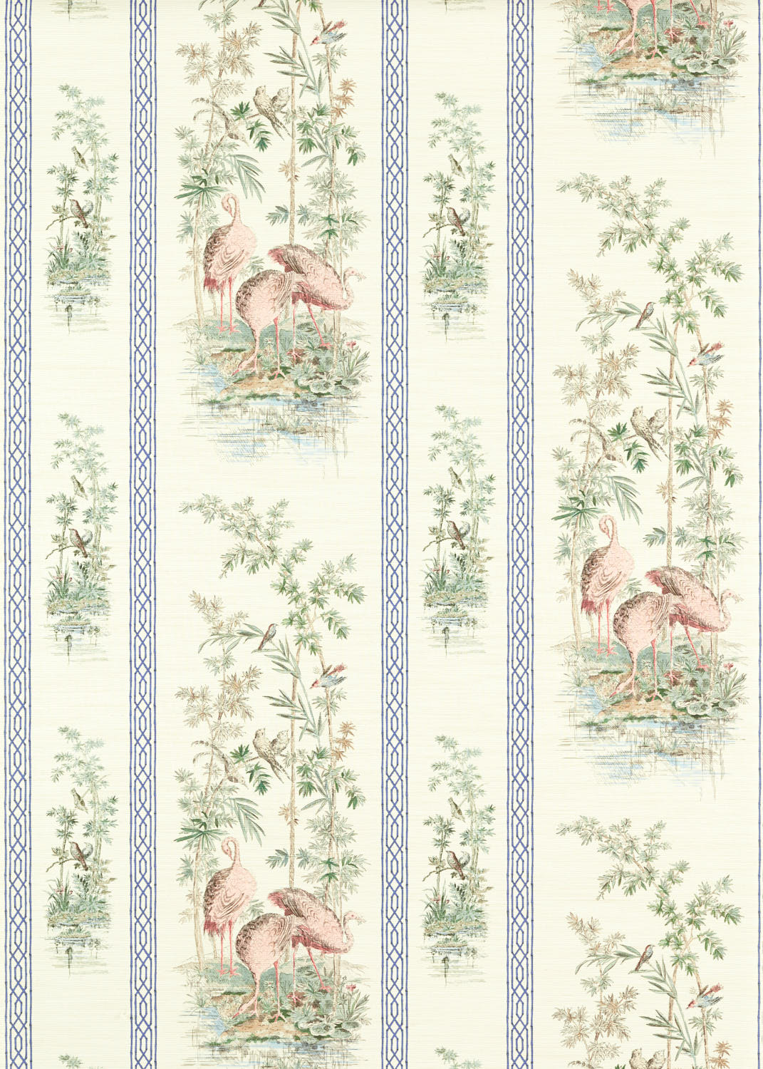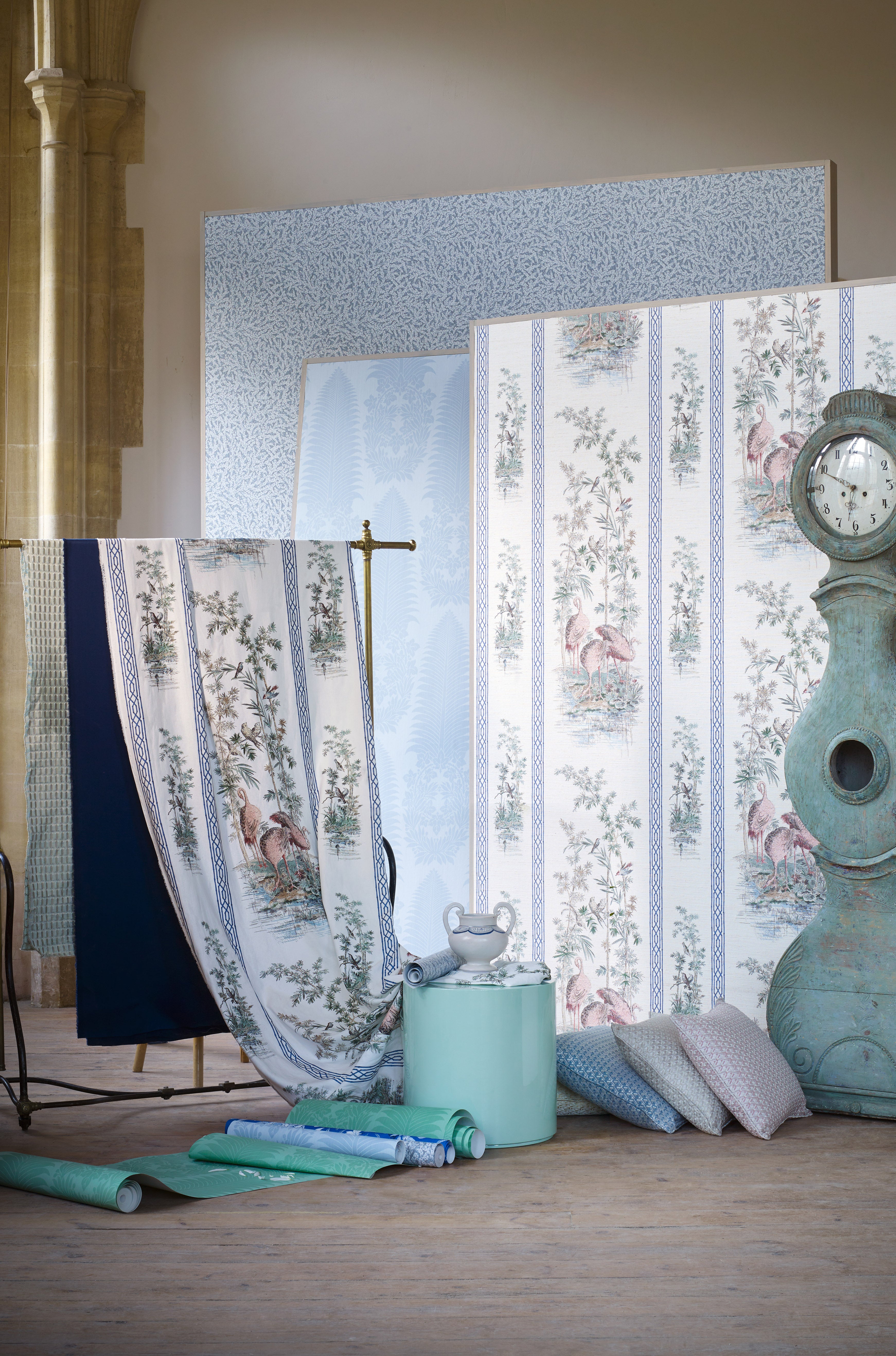 Depicting storks stood at the water’s edge and small birds perched on nearby branches, the original version of this wallpaper is believed to date between 1825 and 1850. Discovered hidden behind oak panelling at Temple Newsham in 1894, this adaptation’s pictorial scene is framed by bamboo lattice work, which amplifies the height of the design. Digitally printed on woven grass cloth.