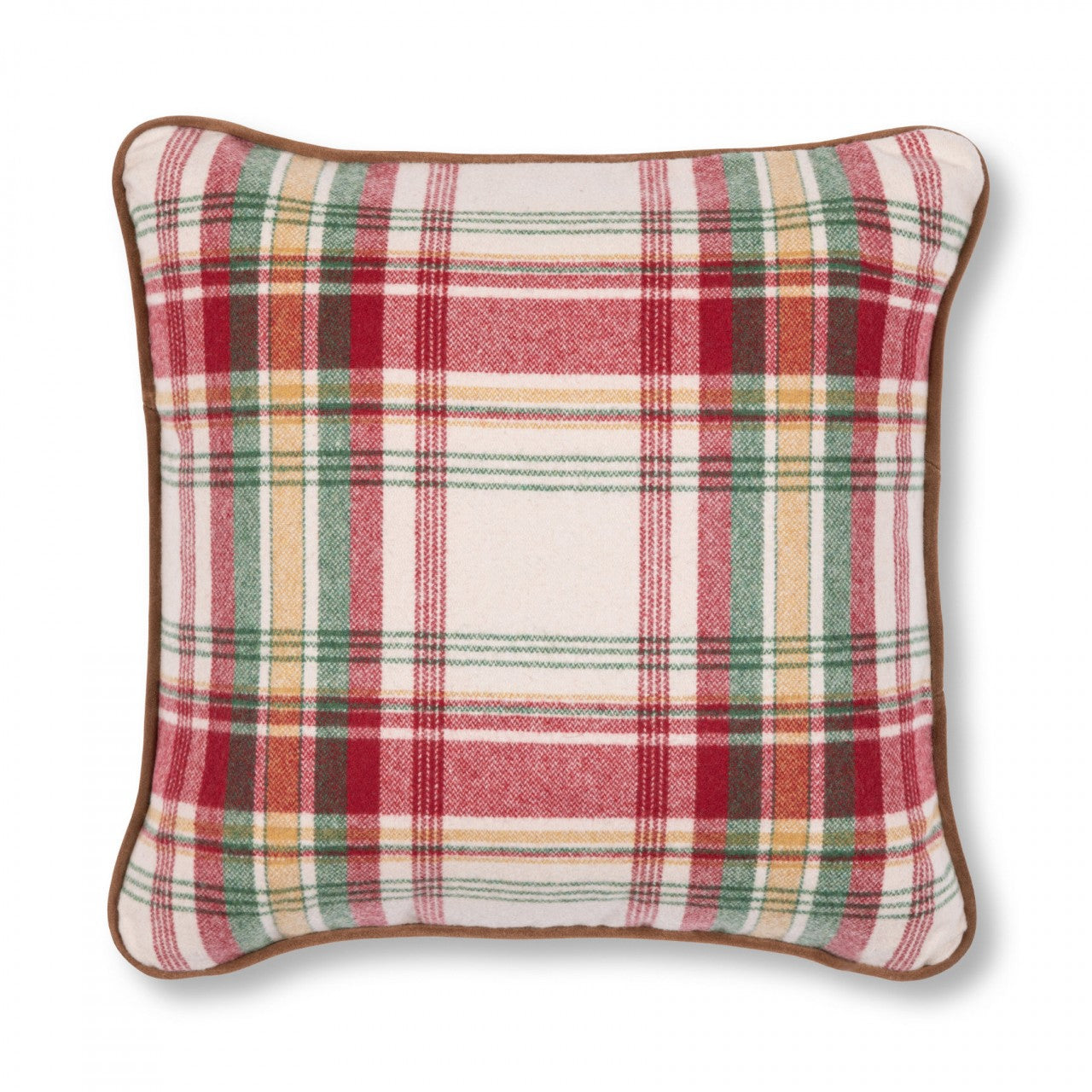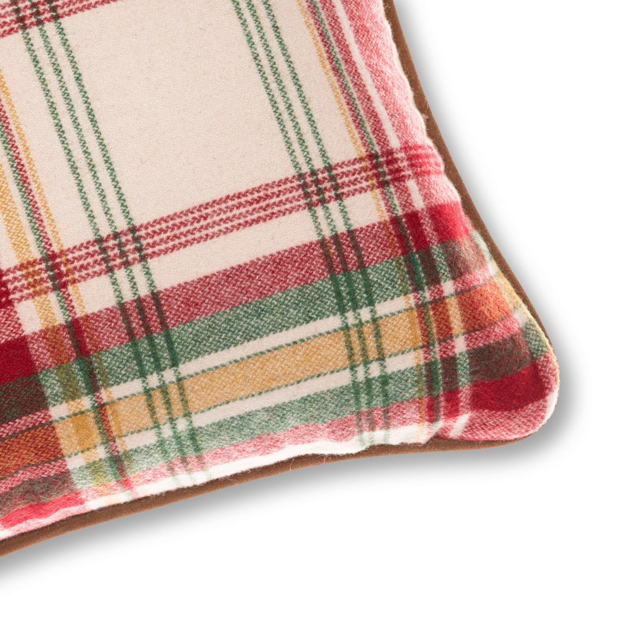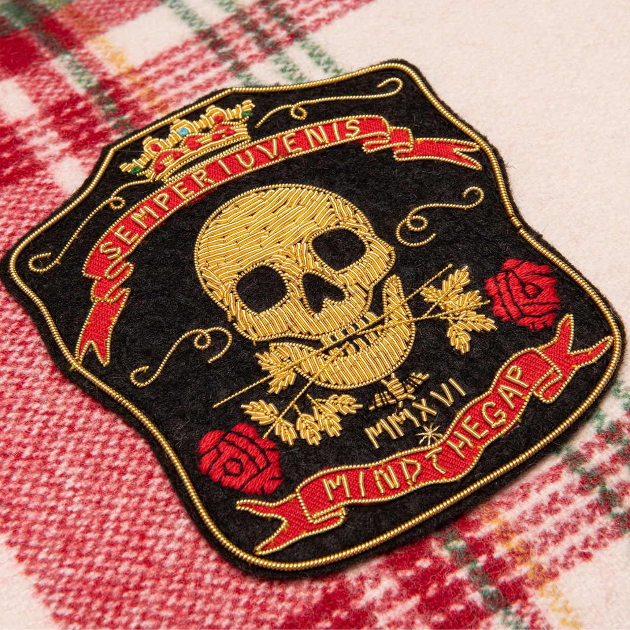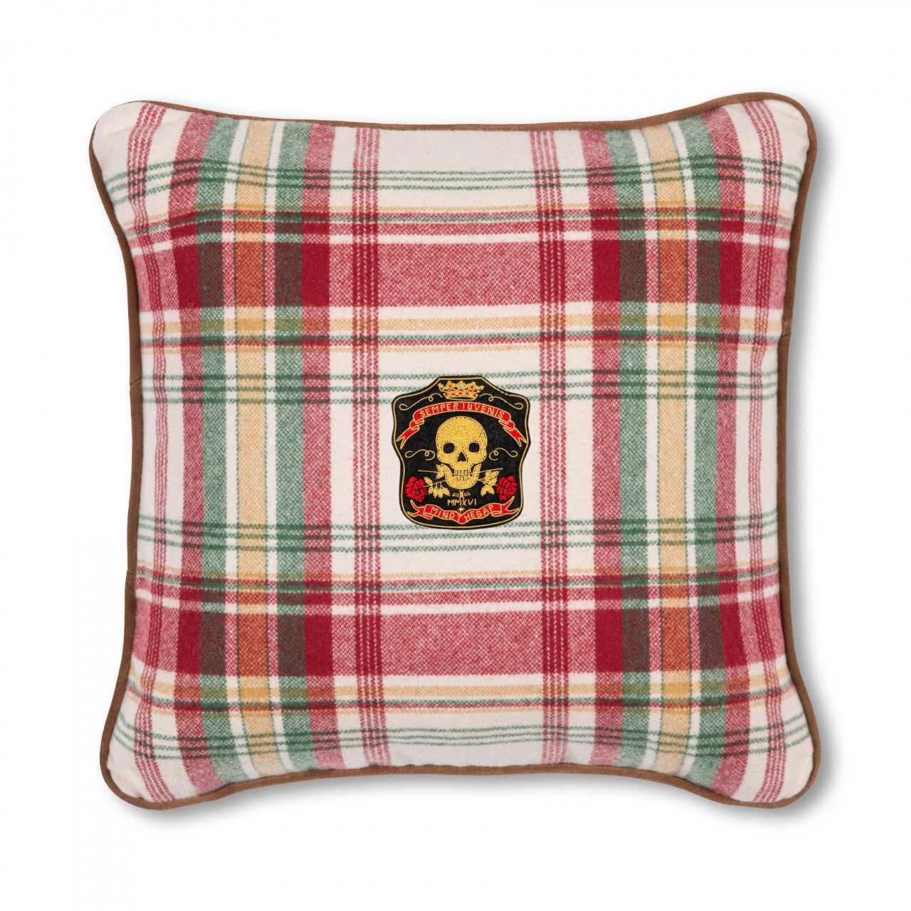 Named after the county in which the 1969 Woodstock Festival took place, this bold check makes a statement, emulating the strong narrative behind the counterculture movement itself. The combination of red, green, and yellow stands out on a white background with a brown leather piped edge bringing the colour scheme together. The wool SULLIVAN PLAID cushion has a duck feather filling and the front cover is decorated with a beautiful hand-embroidered metallic bullion displaying a skull and two roses representing the main symbol of the Woodstock Collection, Semper Iuvenis.