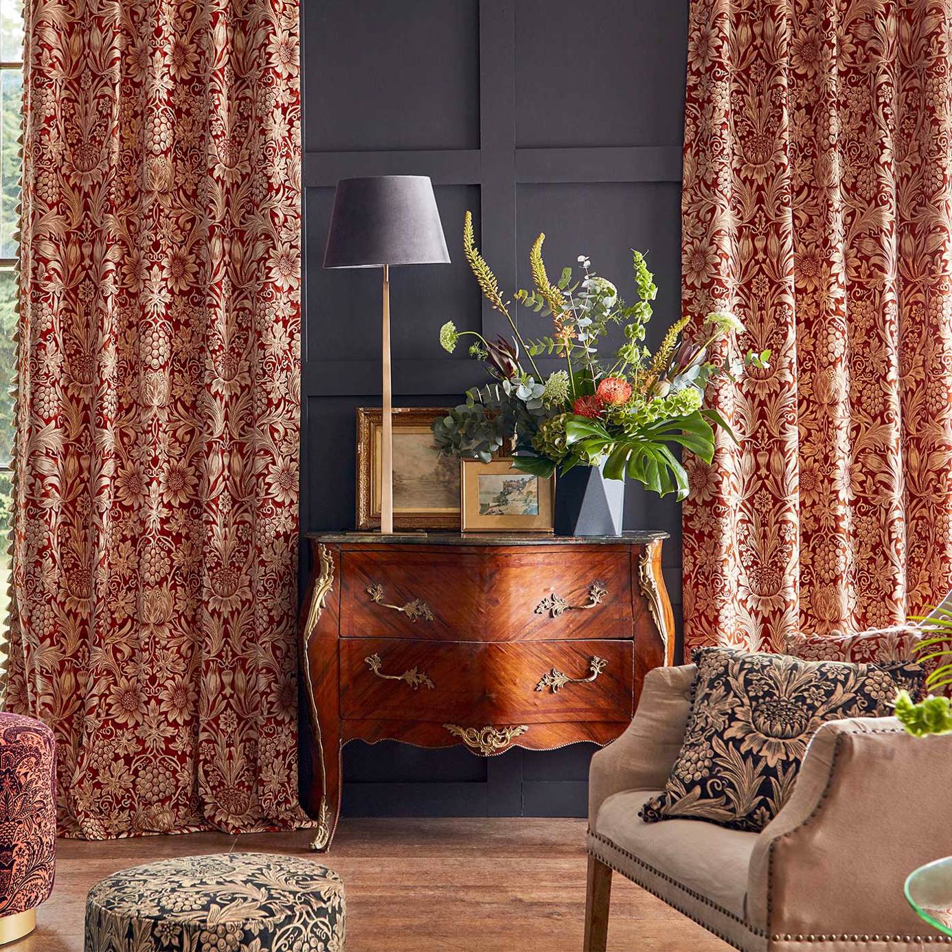 This striking pattern was first designed by William Morris in 1879 and displays a stylised sunflower on a sumptuous velvet ground. An elegantly relaxed semi-plain design across three dramatic colourways, Sunflower Velvet is suitable for drapes and upholstery. The captivating Saffron/Vellum colourway is new to this collection and provides an alternative take on a Morris classic.