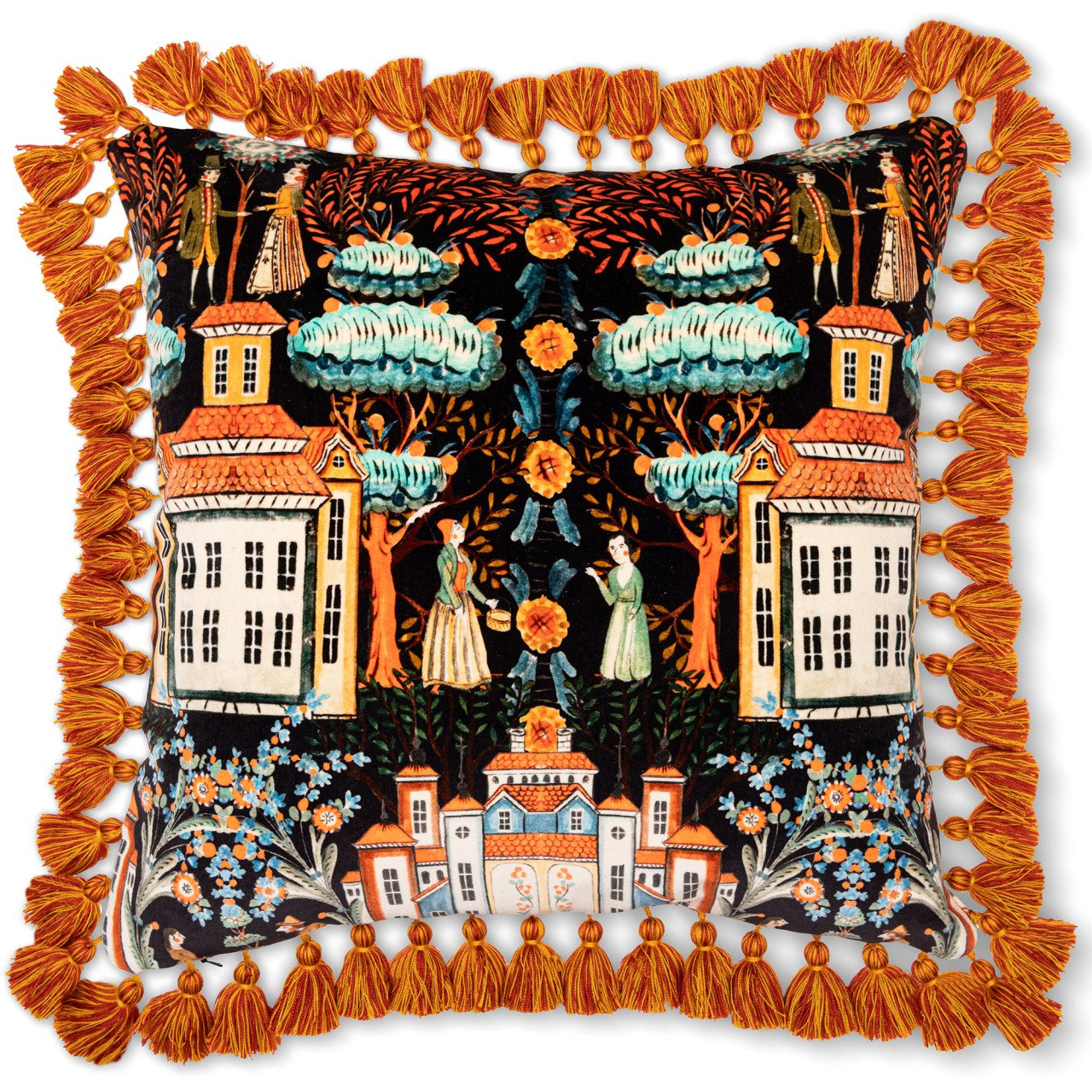 Edged in a row of lustrous, golden tassels, the TALES OF TYROL cushion is a bold design that celebrates magical Tyrolean folklore, where charming, rosycheeked characters inhabit a world of fantasy and wonder. Made of cotton velvet, this whimsy cushion adds character and boldness to any interior scheme.