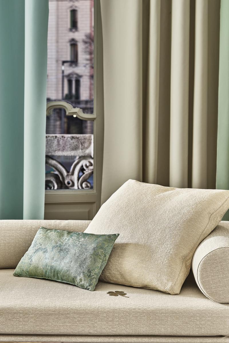 It’s as if it hides inside unexpected precious elements, just like certain metallic stones that reveal an unexpected sparkle when cut. The filler weft is made from waste from the Rubelli mill from false selvedges, and is therefore an example of recycling, of circular economy.
