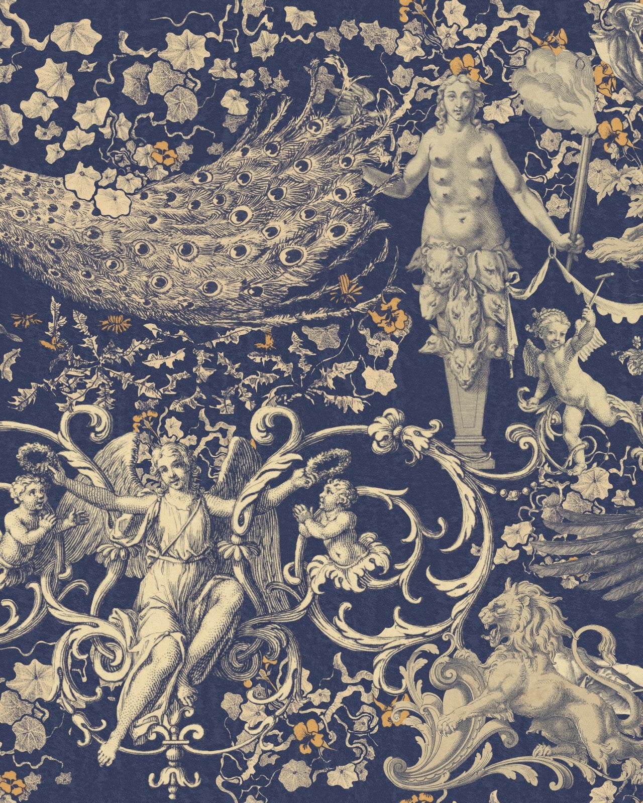 Inspired by antique illustrations of fairies and angels, THE PROMISE LAND is depicting an imaginary world with impressive celestial beings and large scale ornaments. Part of the IMAGINARIUM collection, this design is created on 3 rolls for maximising the pattern repetition. The design is printed over 3 panels.