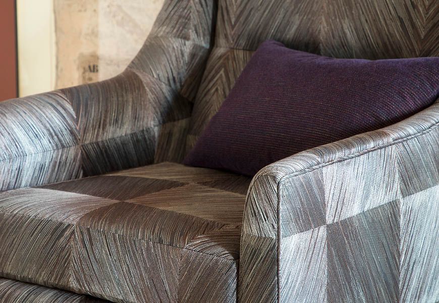 Titania is a striking geometric fabric with a soft metallic sheen and beautifully layered directional lines. Its refined shimmer and sculpted pattern bring modern glamour and polished sophistication to any upholstered piece.