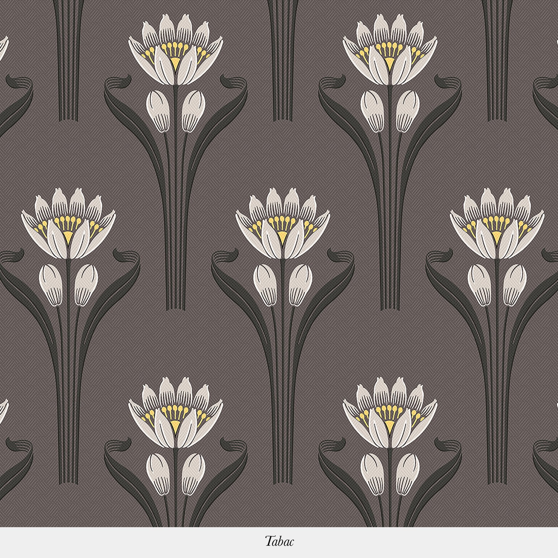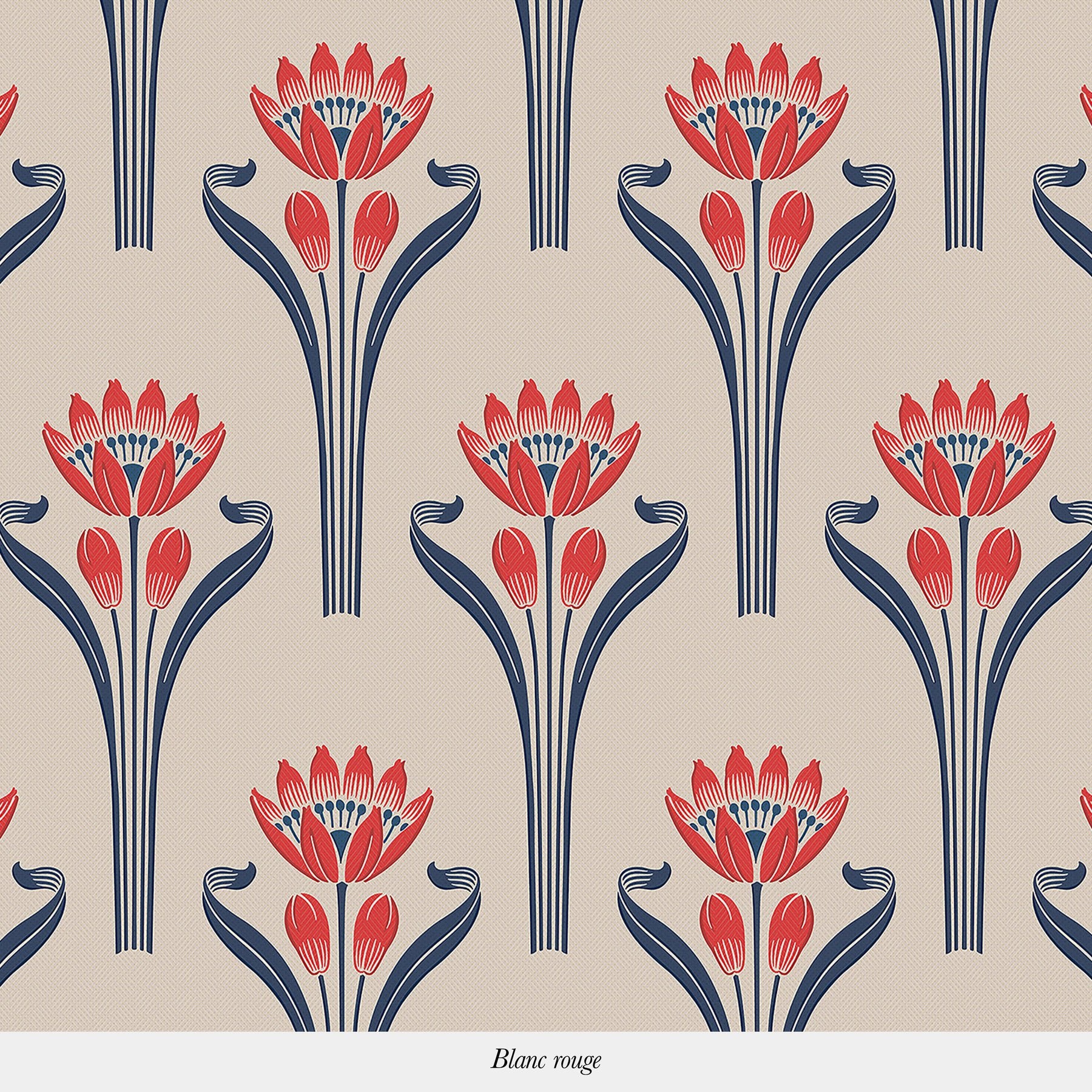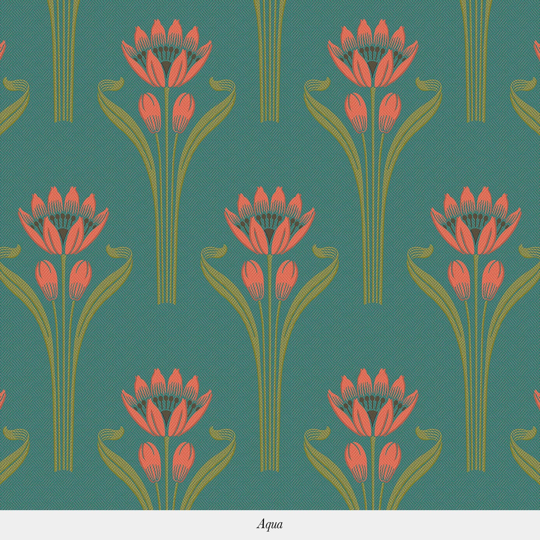 This wallpaper consists of a pattern representing a blooming tulip in an art deco style against a background with a textile feel. The delicacy of the tulip's leaves and stalks support the bloom and it's pistil.