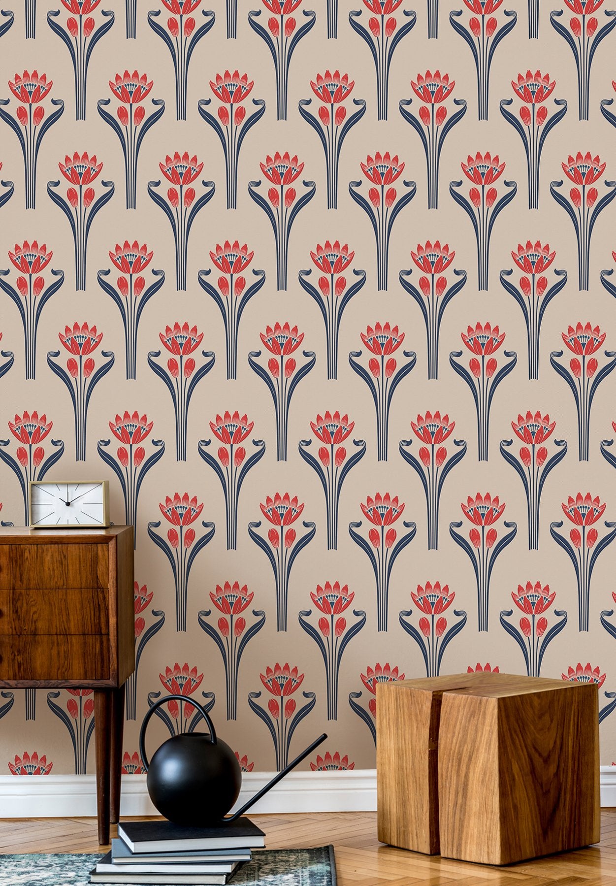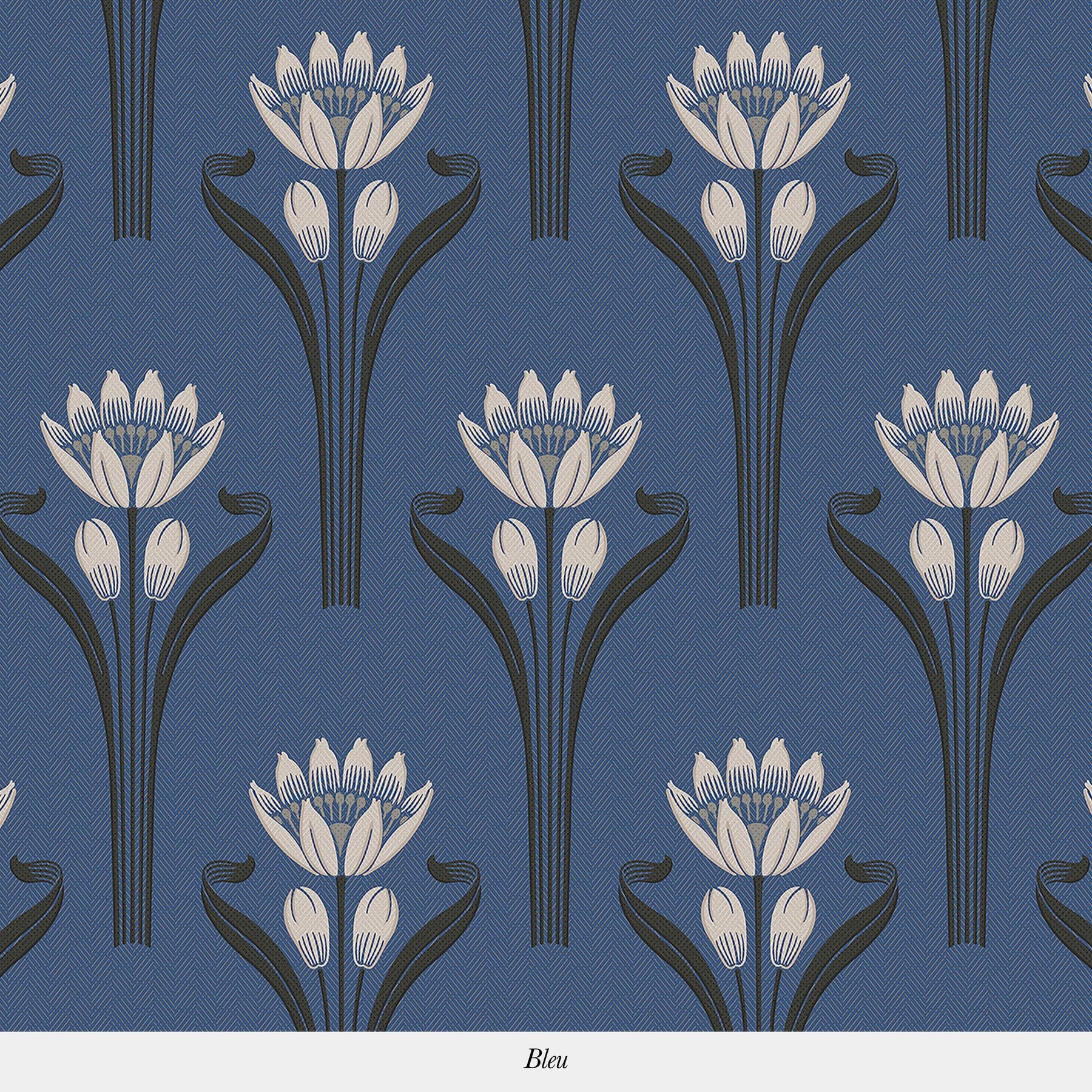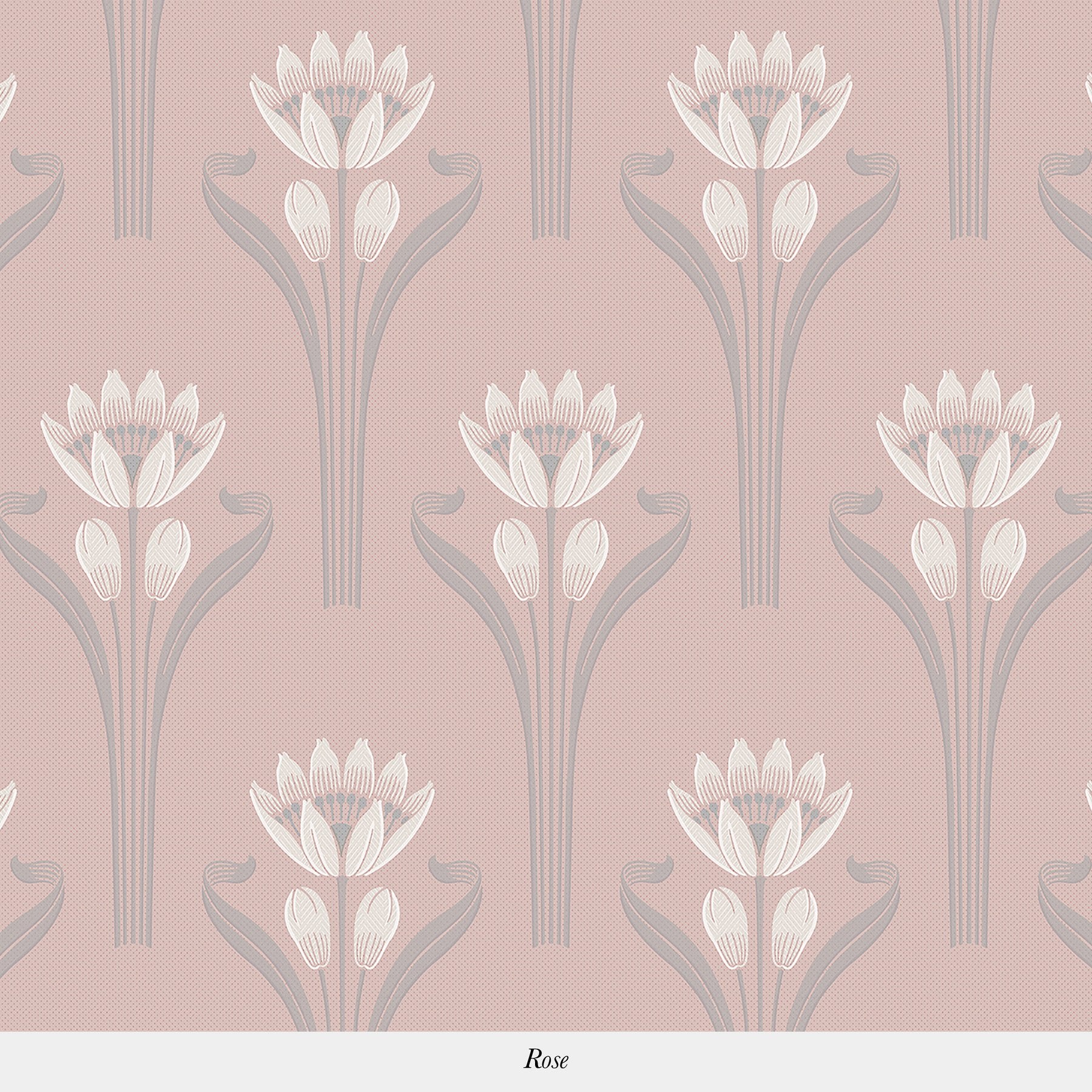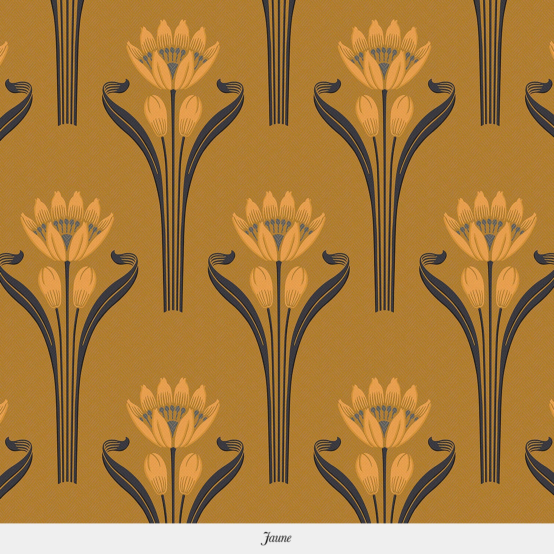 This wallpaper consists of a pattern representing a blooming tulip in an art deco style against a background with a textile feel. The delicacy of the tulip's leaves and stalks support the bloom and it's pistil.