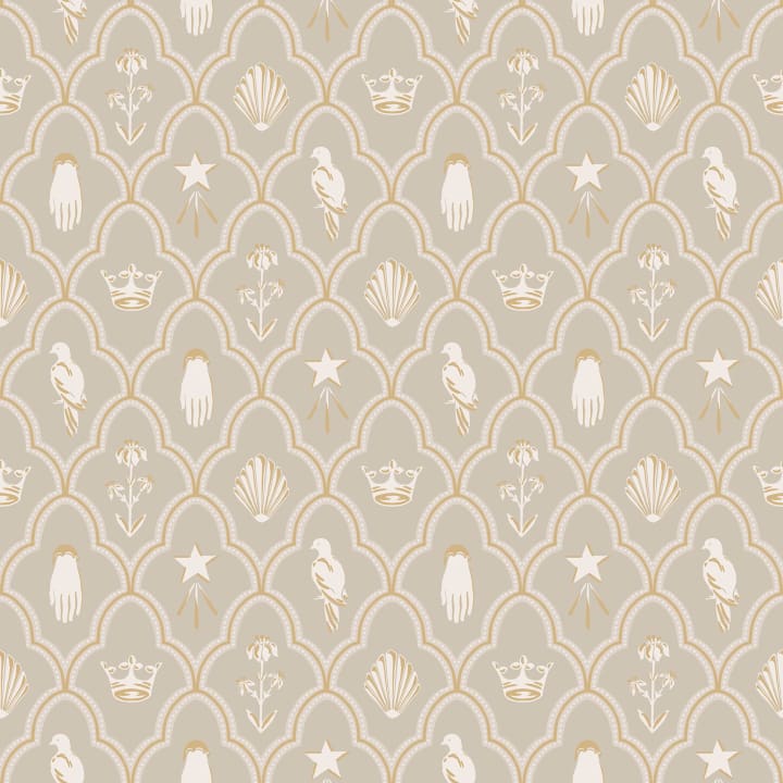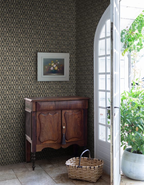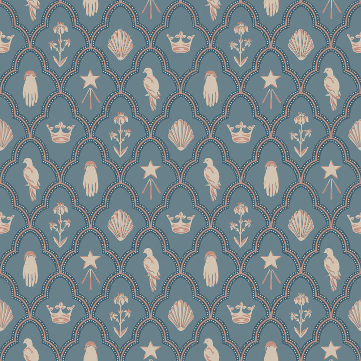 Full of symbolic references to the Bearn: a crown to commemorate the birthplace of a Swedish king as well as a French King, Edelweiss, a flower synonymous with Spring in the Pyrenees and a symbol of purity and innocence, the hand so often seen as a brass knocker on the doors of Béarnaise houses and a Turtledove, the namesake of the chateau’s barn La Grange aux Tourterelles, almost never without at least one to adorn its roof. This Turtledove barn wallpaper has the colorway indigo blue.