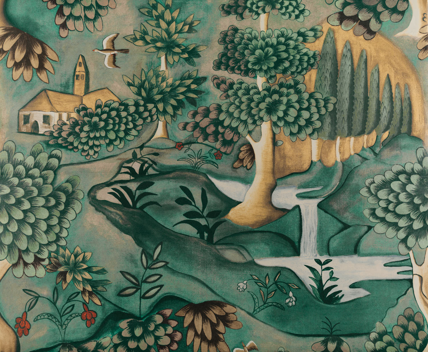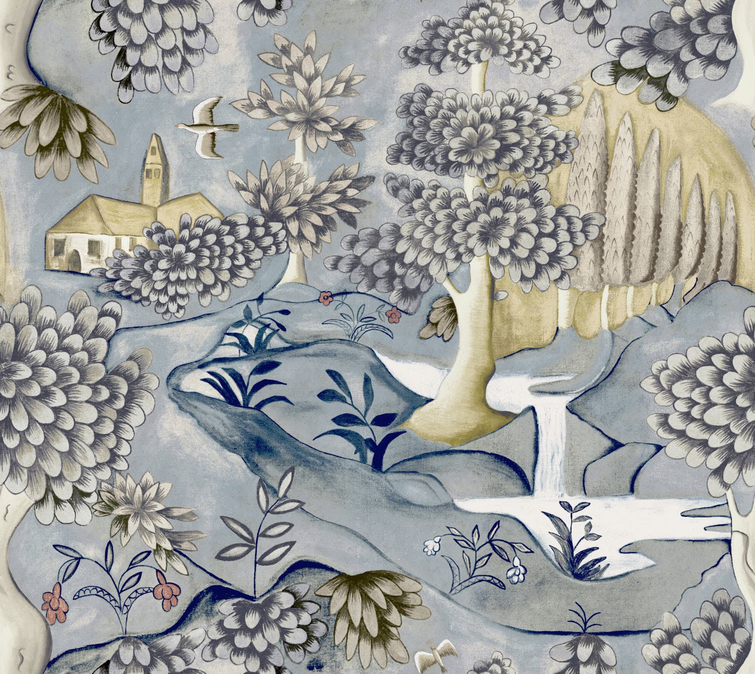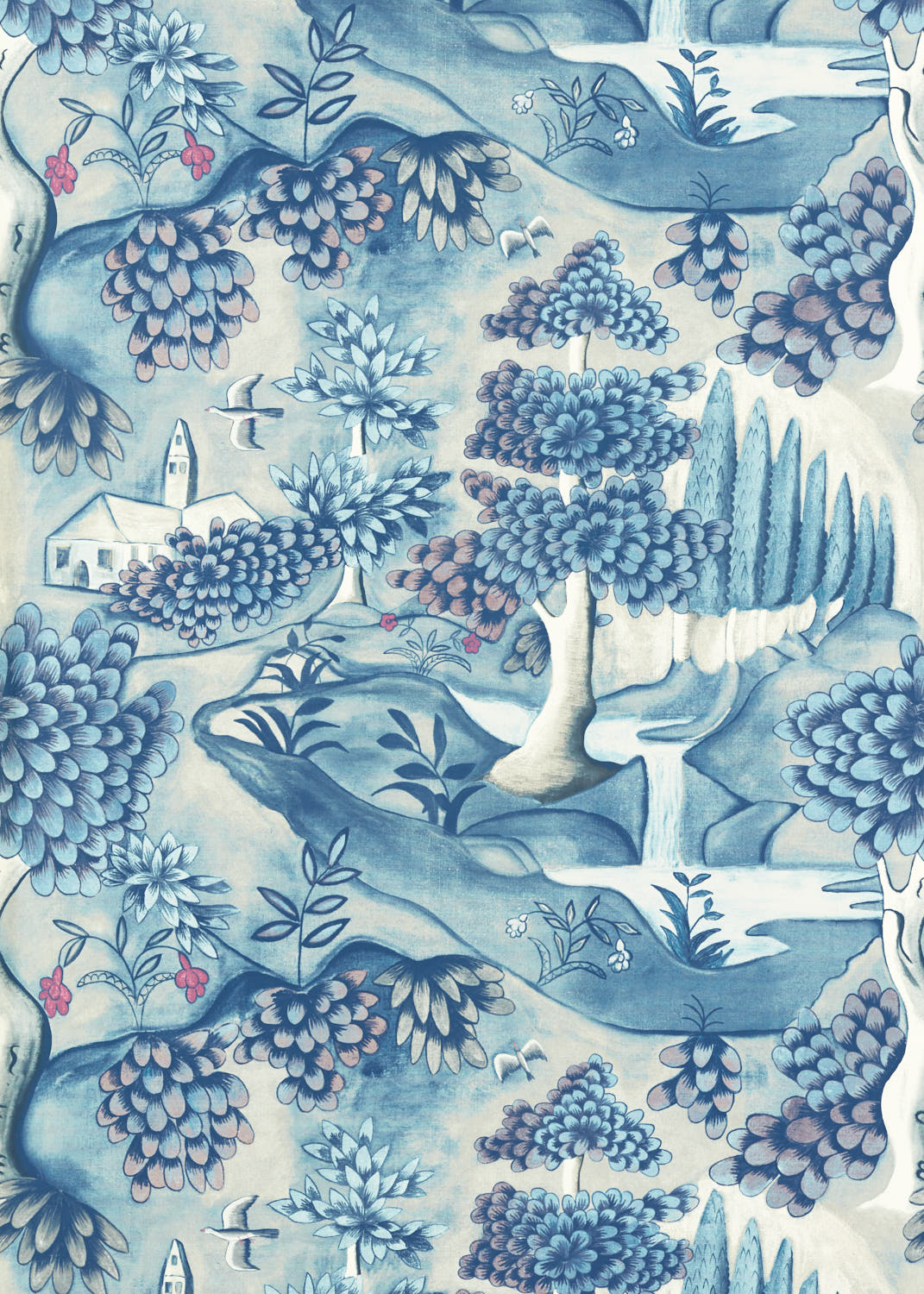 Depicting a lush pastoral landscape with a church and waterfalls, and influenced by religious and hunting themes, this wallpaper is based on a late 17th century painted cloth. Digitally printed on a non-woven paper in two colourways, it also available as a printed linen fabric. Stunning teamed with antiques, or by way of contrast alongside ultra-modern furniture pieces.Priced by the metre in 1.22 increments