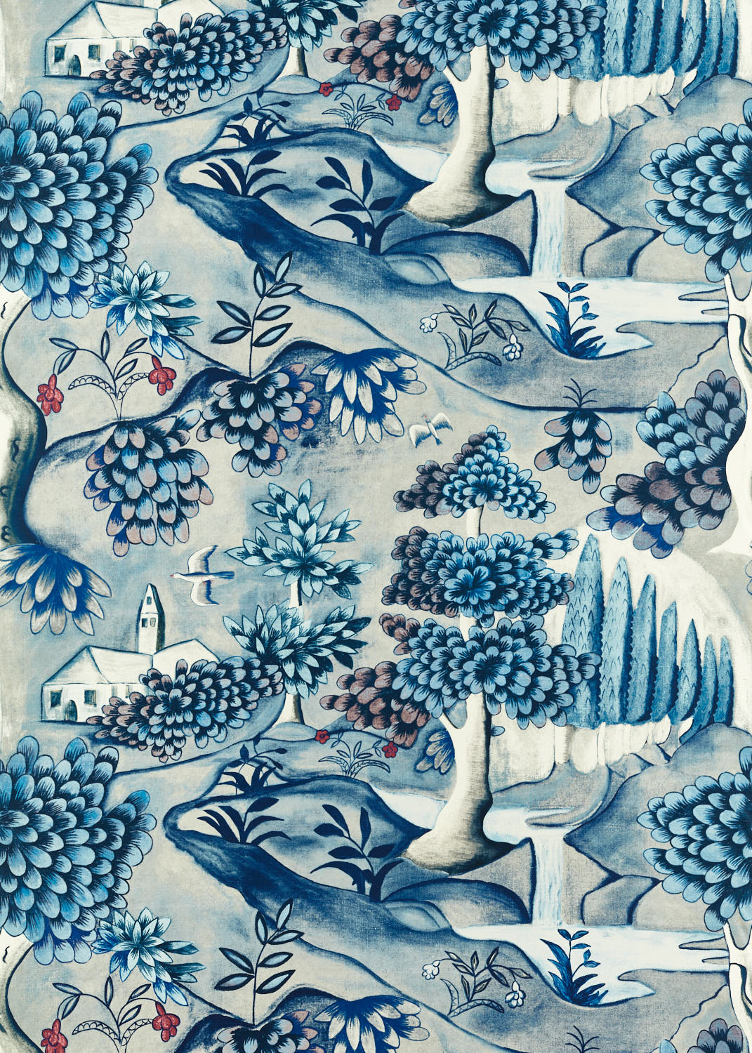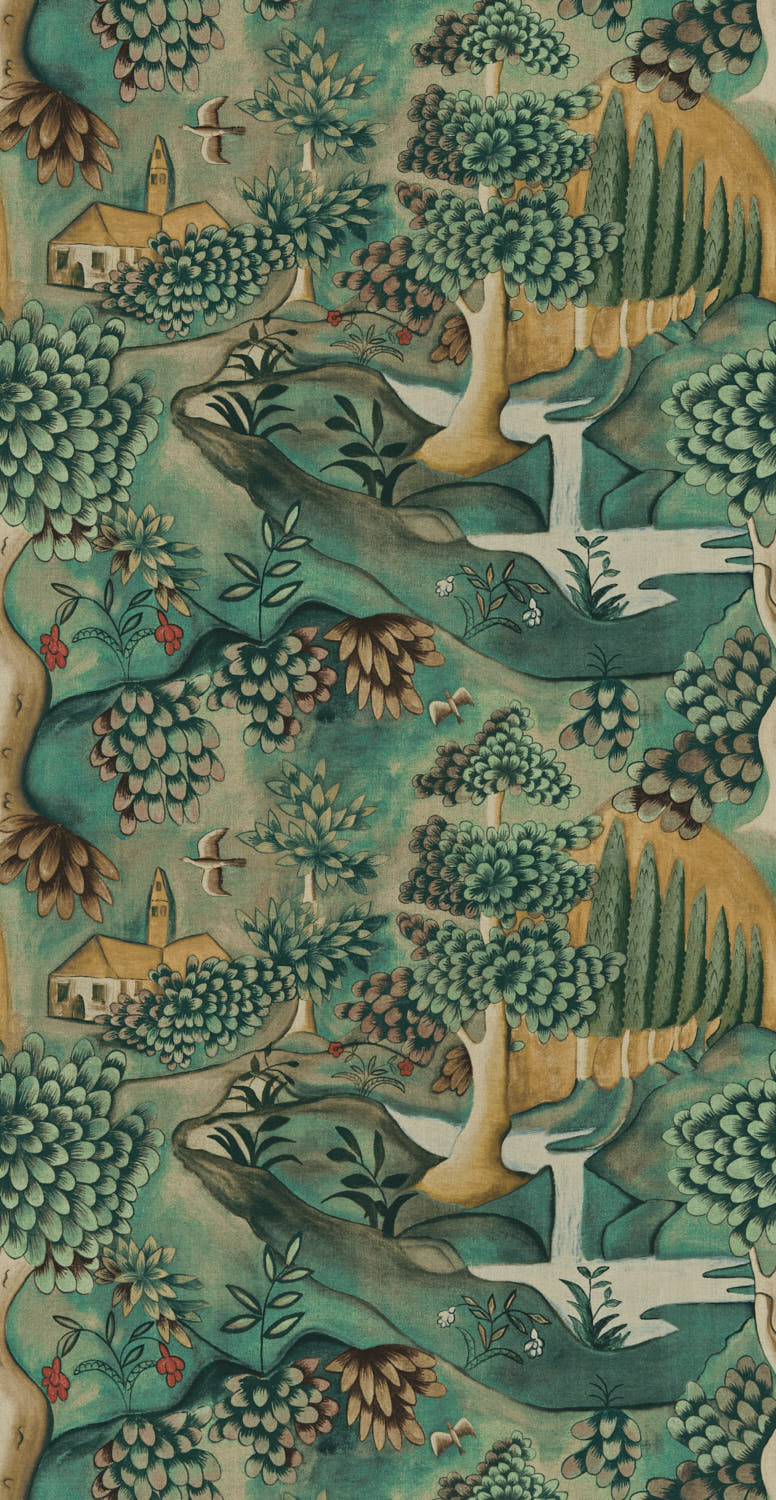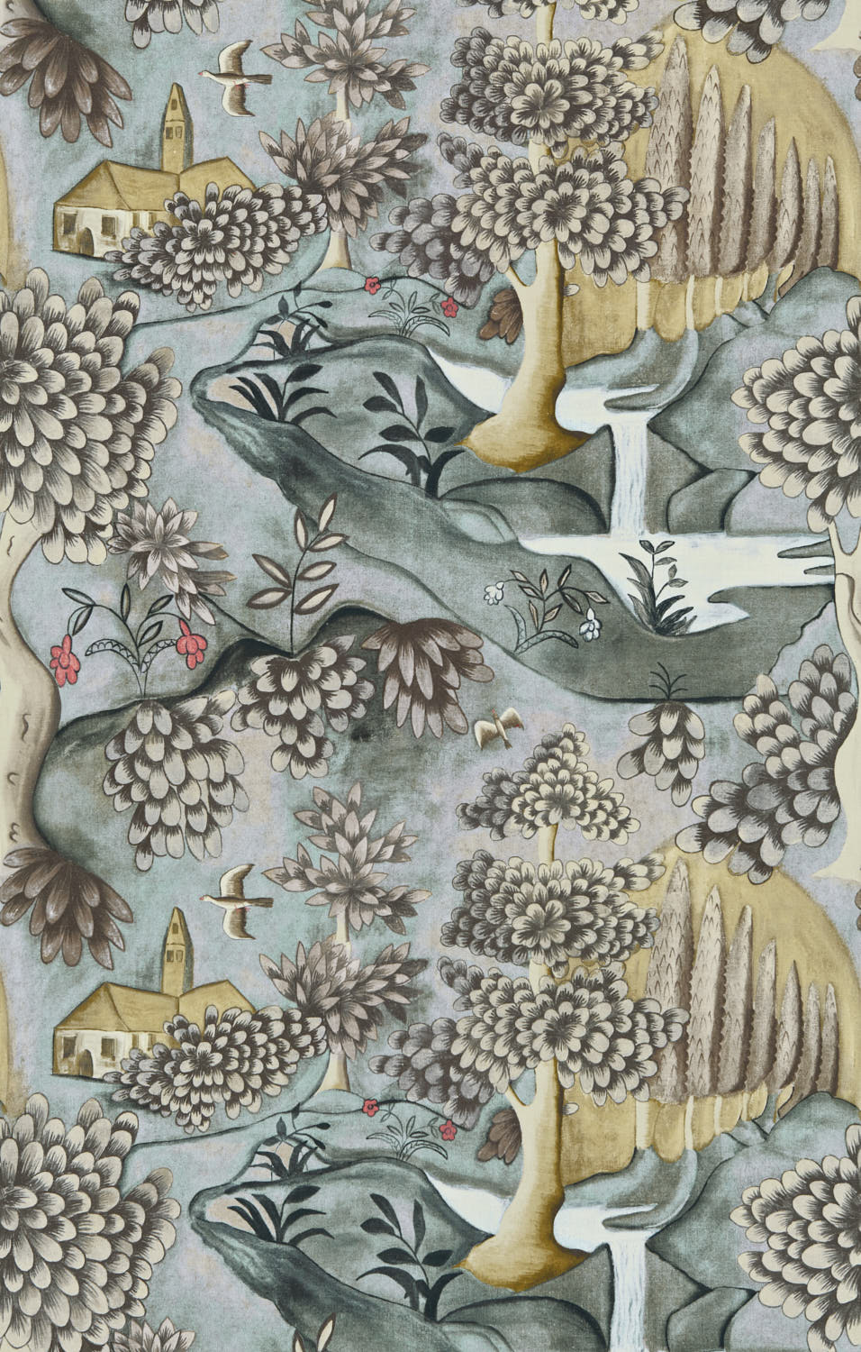 Depicting a lush pastoral landscape with a church and waterfalls, and influenced by religious and hunting themes, this 100% linen fabric is based on a late 17th century painted cloth and is available in two colourways and as a wallpaper. Stunning teamed with antiques, or by way of contrast alongside ultra-modern furniture pieces.