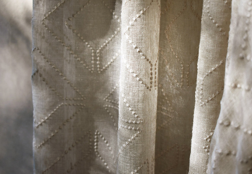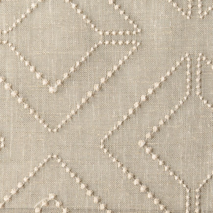 Voyage is an airy linen-blend sheer embroidered with a delicate geometric pattern that catches light beautifully. Soft, natural and quietly refined, it brings effortless elegance to windows and gentle movement to any space.